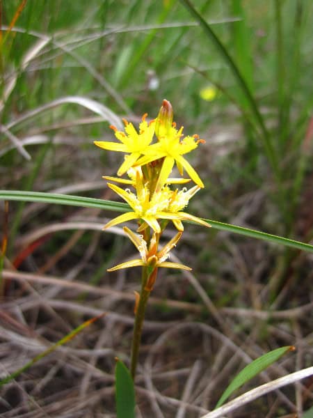 A vibrant yellow wildflower growing amidst grass and natural landscape, perfect for outdoor hikers and nature lovers interested in discovering unique floral species.