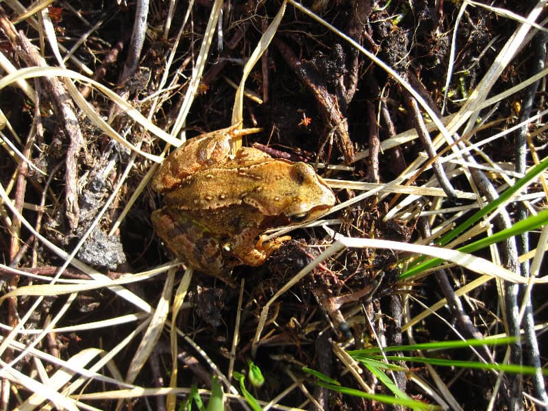 A yellow-brown frog blending into ground cover with grass and soil, perfect for nature photography and wildlife observation.