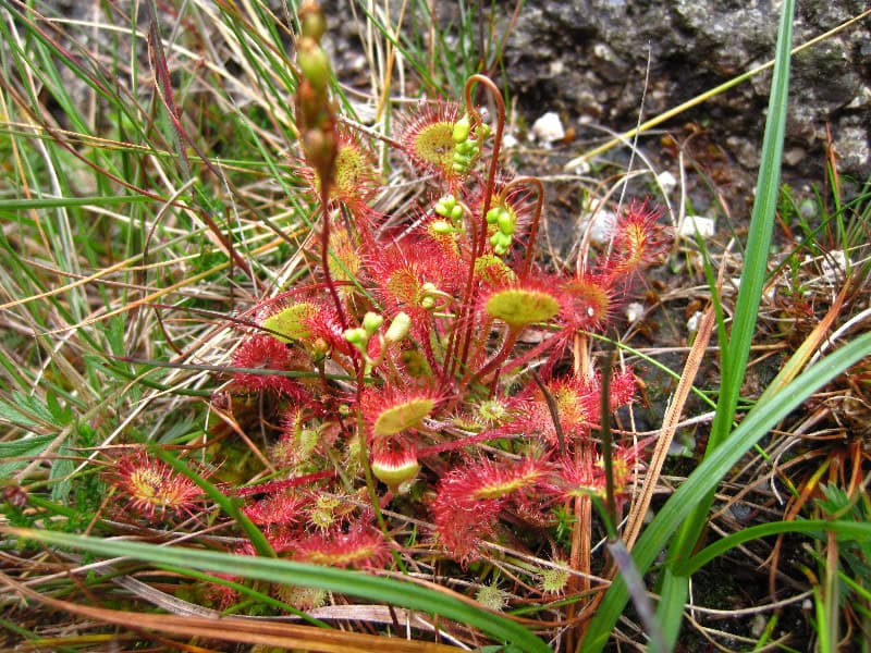 A detailed close-up of sundew plants (Drosera) showcasing their distinctive red and green sticky leaves, which trap insects. Perfect for outdoor enthusiasts and nature lovers, this image highlights the unique beauty of carnivorous plants in their natural environment. Ideal for hiking, botanical, and nature photography content.