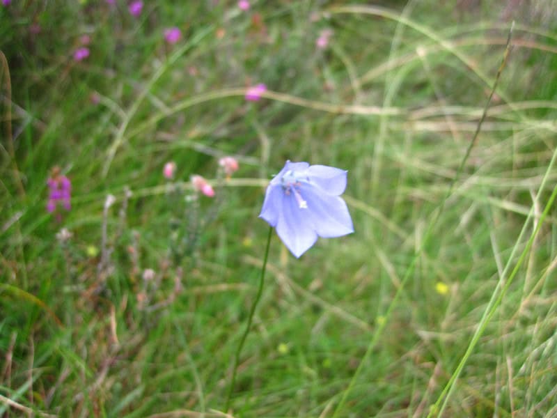 A close-up of a delicate blue wildflower blooming amidst tall grasses and pink blossoms in a lush meadow, capturing the essence of outdoor hiking environments and tranquil natural landscapes.