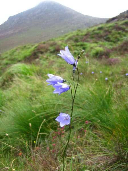 A close-up of a delicate bluebell flower thriving in a lush green mountain landscape, capturing the beauty of wildflowers in outdoor hiking adventures.