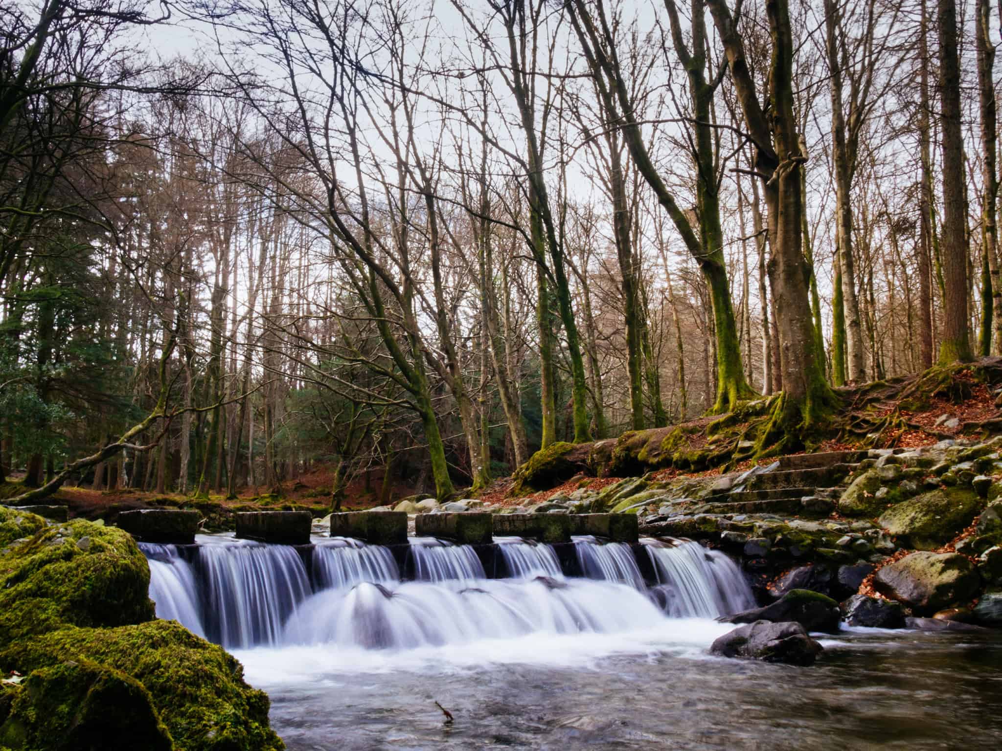 A tranquil forest scene featuring a flowing stream with a gentle waterfall, surrounded by moss-covered stones and leafless trees, perfect for hiking, outdoor exploration, and nature photography enthusiasts seeking scenic trails.