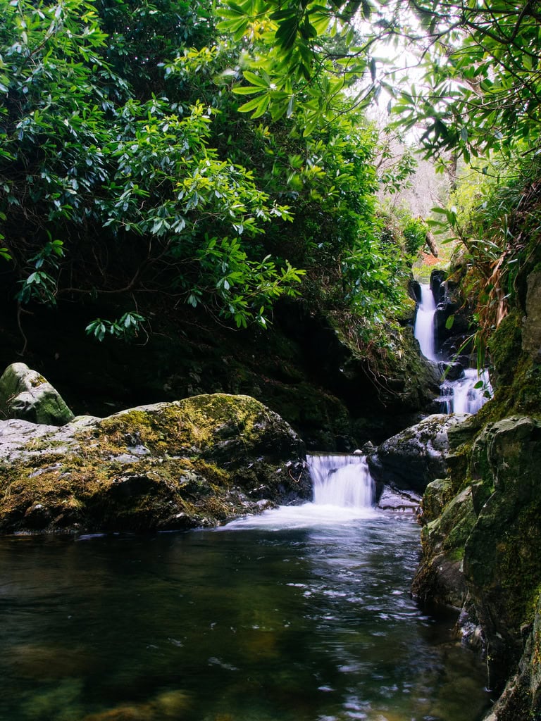 A peaceful forest scene featuring a small waterfall cascading over rocks into a clear, flowing river, with dense greenery and sunlight filtering through the trees, ideal for hiking, nature lovers, and outdoor adventure enthusiasts.