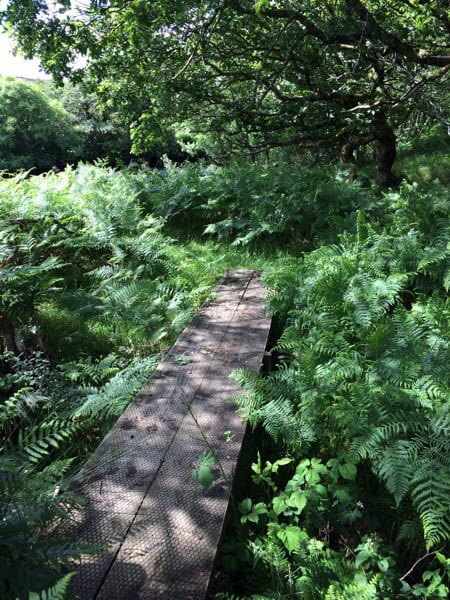 A rustic wooden trail bridge surrounded by dense ferns and trees in a serene forest landscape, ideal for hiking and exploring nature.