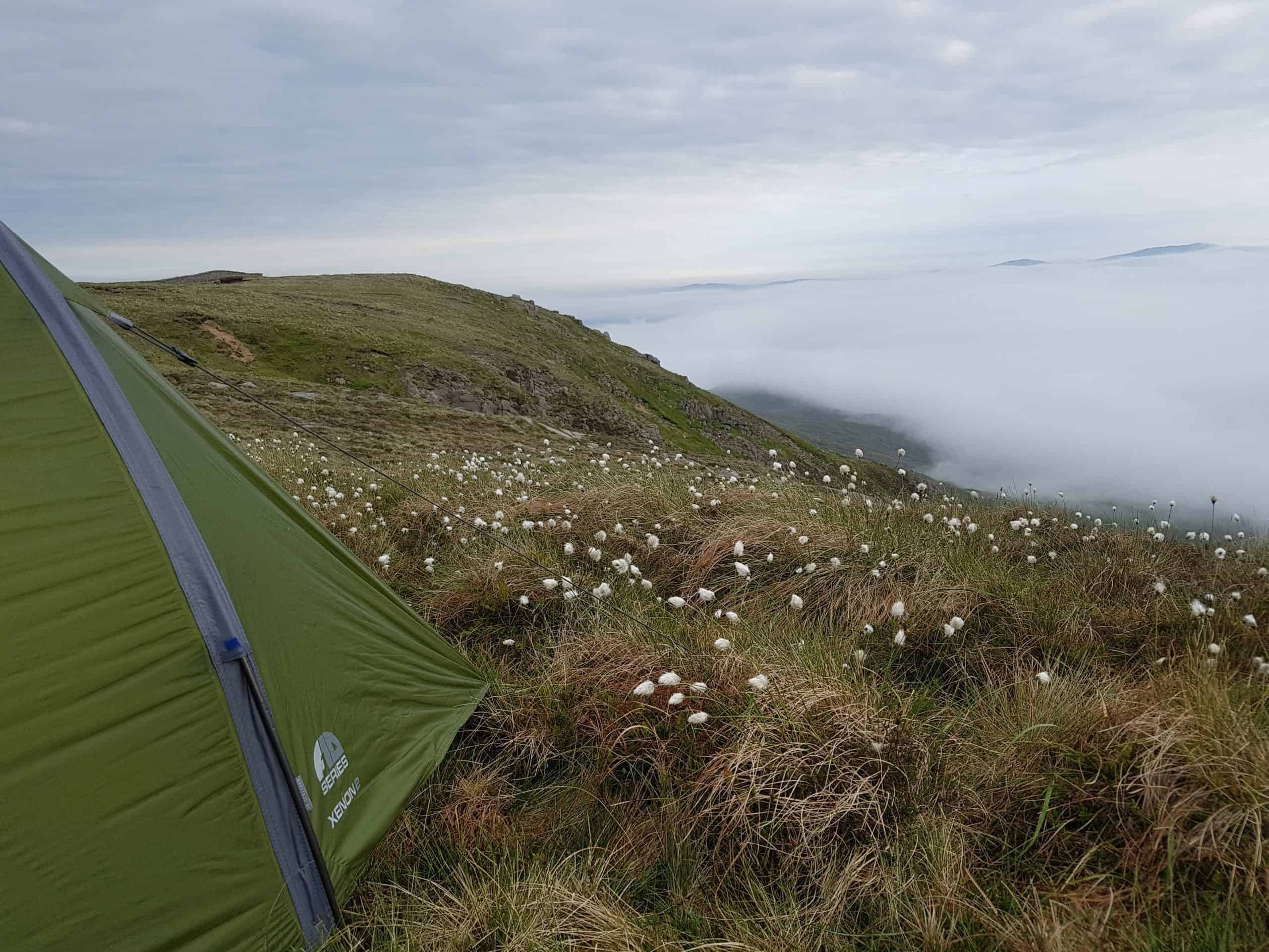Hiking and camping in scenic mountain landscapes featuring a tent among wildflowers and rolling hills with foggy vistas, ideal for outdoor explorers seeking nature and adventure.