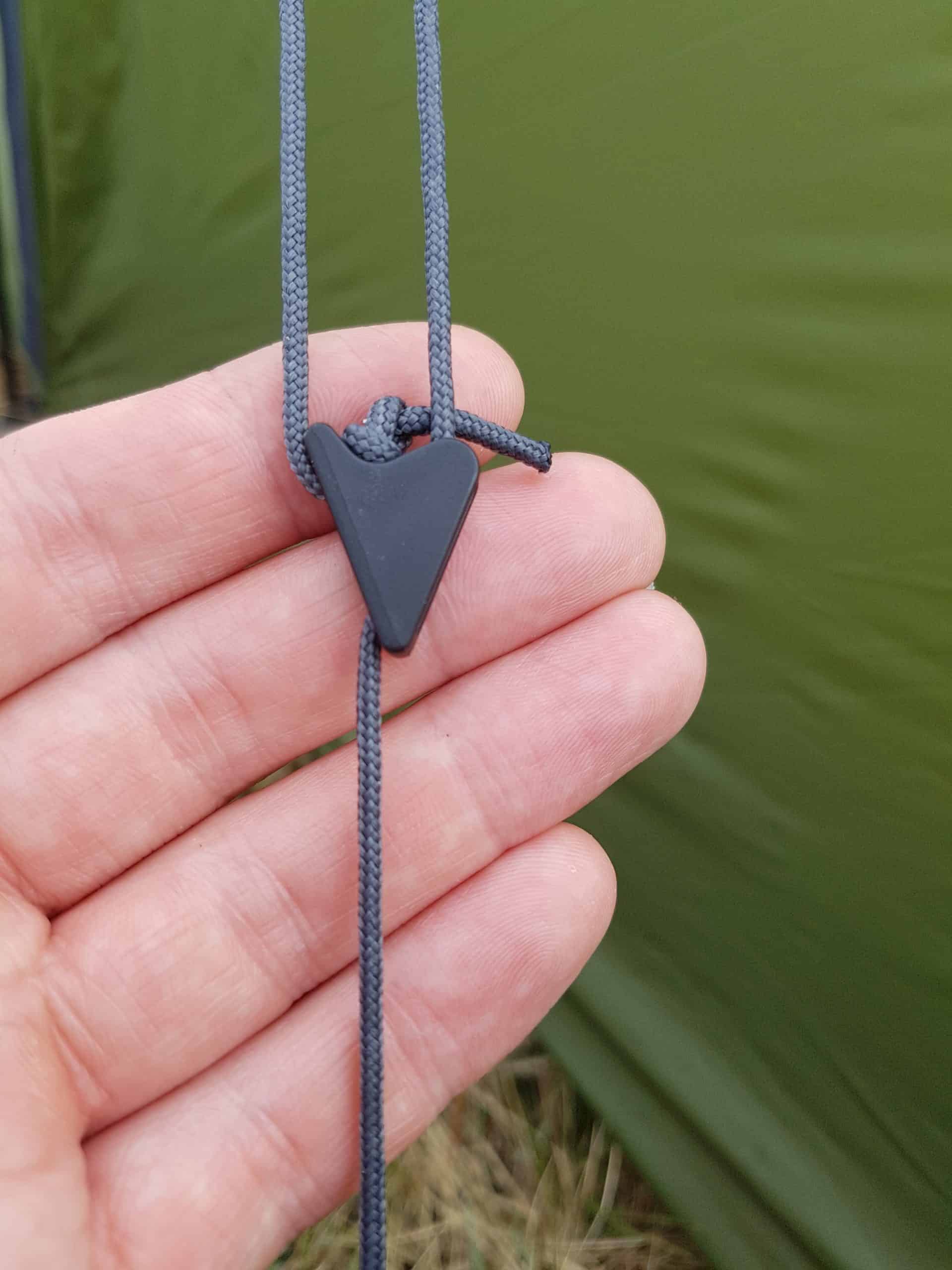 An outdoor gear feature highlighting a durable cord lock on hiking or camping equipment, useful for securing paracord or tent lines during outdoor adventures.