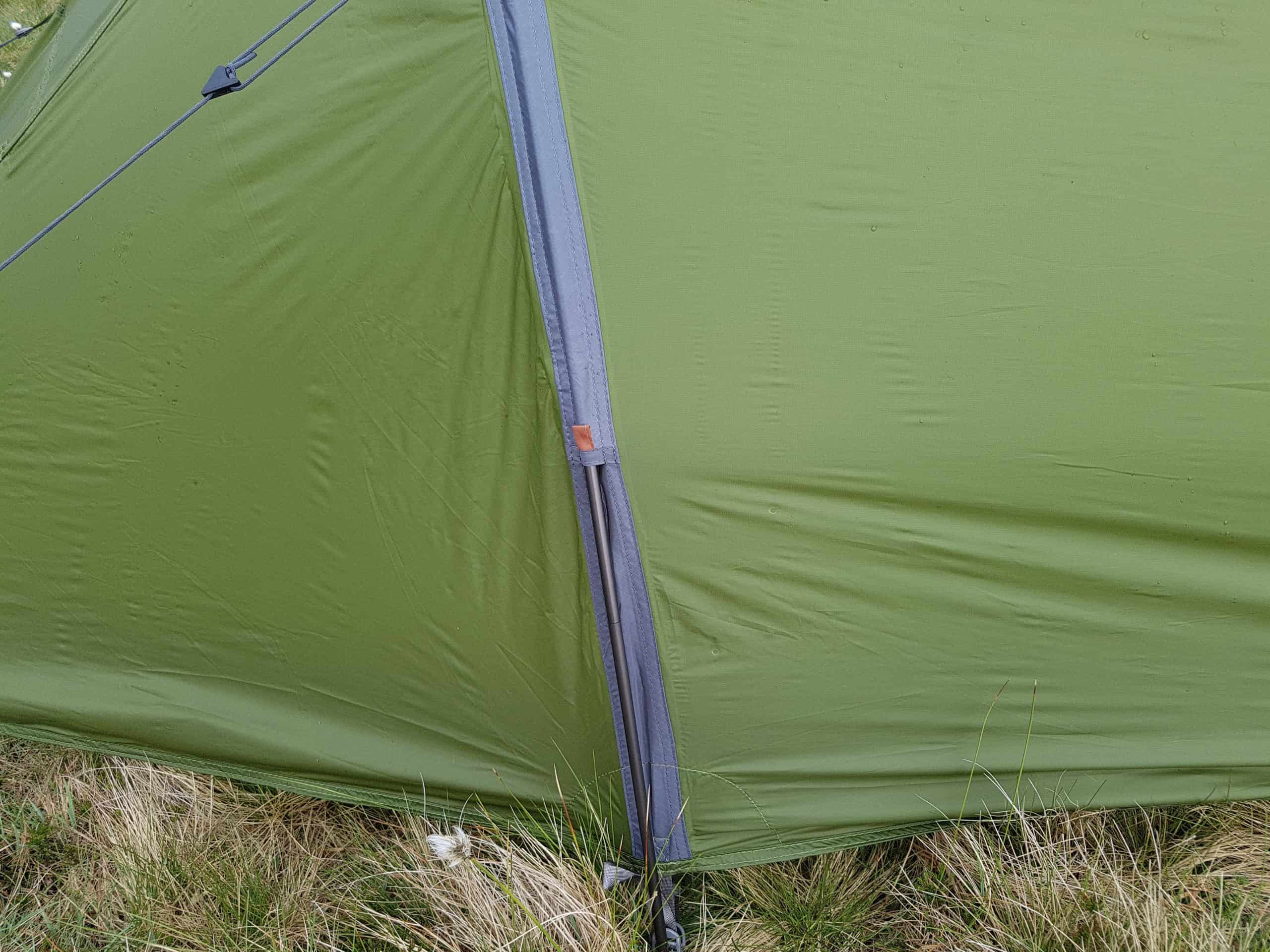 A close-up of a green camping tent showing the corner and stake securing it on grassy terrain. The image highlights outdoor camping gear, ideal for hiking and wilderness adventures.