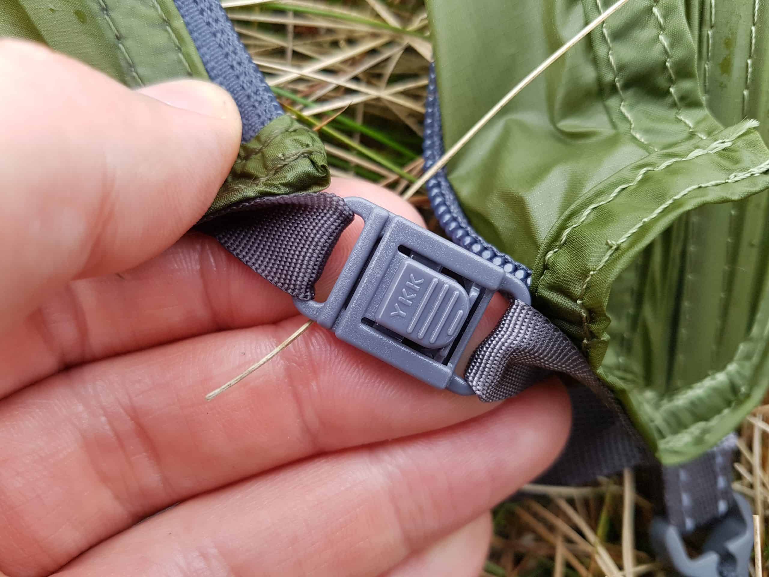 Close-up of a person’s hand holding a grey plastic buckle on a green hiking backpack with adjustable straps. Perfect for outdoor adventures, hiking gear, and backpack customization.