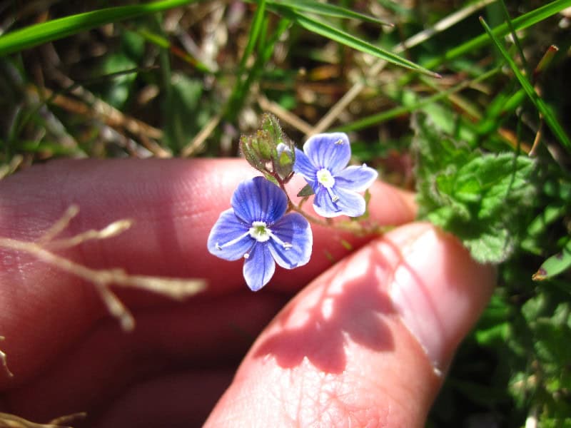 A close-up image of delicate blue wildflowers being gently held by a person’s fingers amidst grass and greenery, highlighting the beauty of outdoor flora and botanical details during a hike or nature walk. This macro shot showcases the intricate petals and natural environment, perfect for outdoor enthusiasts and nature lovers exploring hiking trails and wildflower habitats.