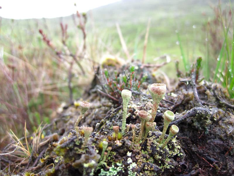 Close-up of moss and lichen growing on decayed wood, showcasing details of forest floor flora for outdoor enthusiasts and hikers.