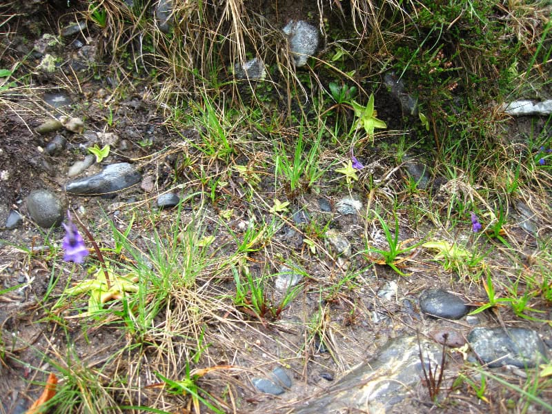 Vivid wildflowers and grasses growing amidst rocks and soil, highlighting mountain trail flora perfect for hiking and nature exploration.