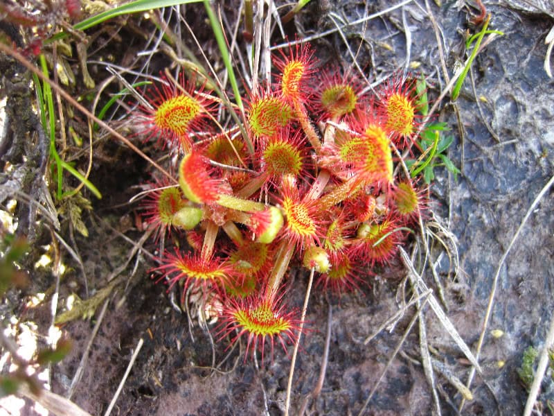 Sun-dew plant (Drosera) close-up showing vibrant red and yellow leaves with sticky glandular hairs, thriving in moist, boggy environments with adaptations for insect trapping and digestion.