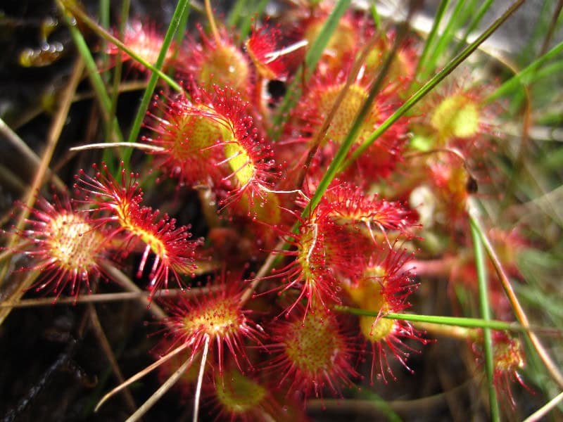 Vibrant red sundew plants with glistening sticky tentacles, showcasing their insect-trapping mechanisms in a natural outdoor setting, ideal for hiking, outdoor adventures, and nature photography enthusiasts.