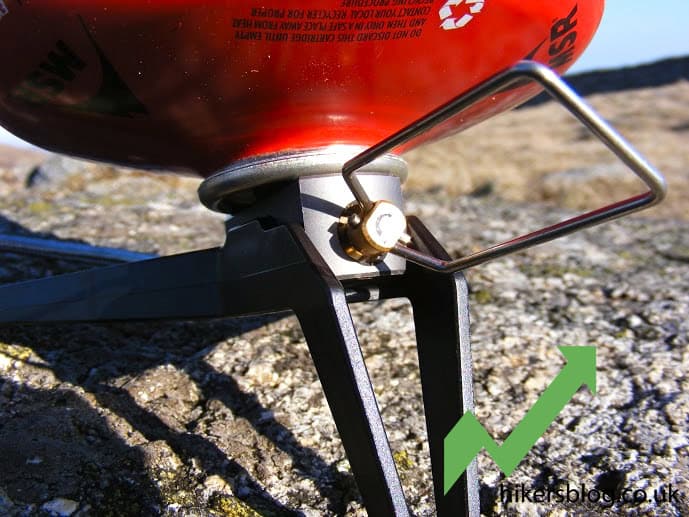 A portable camping stove with a propane canister, perfect for outdoor hiking, camping, and adventure trips on rugged terrain.