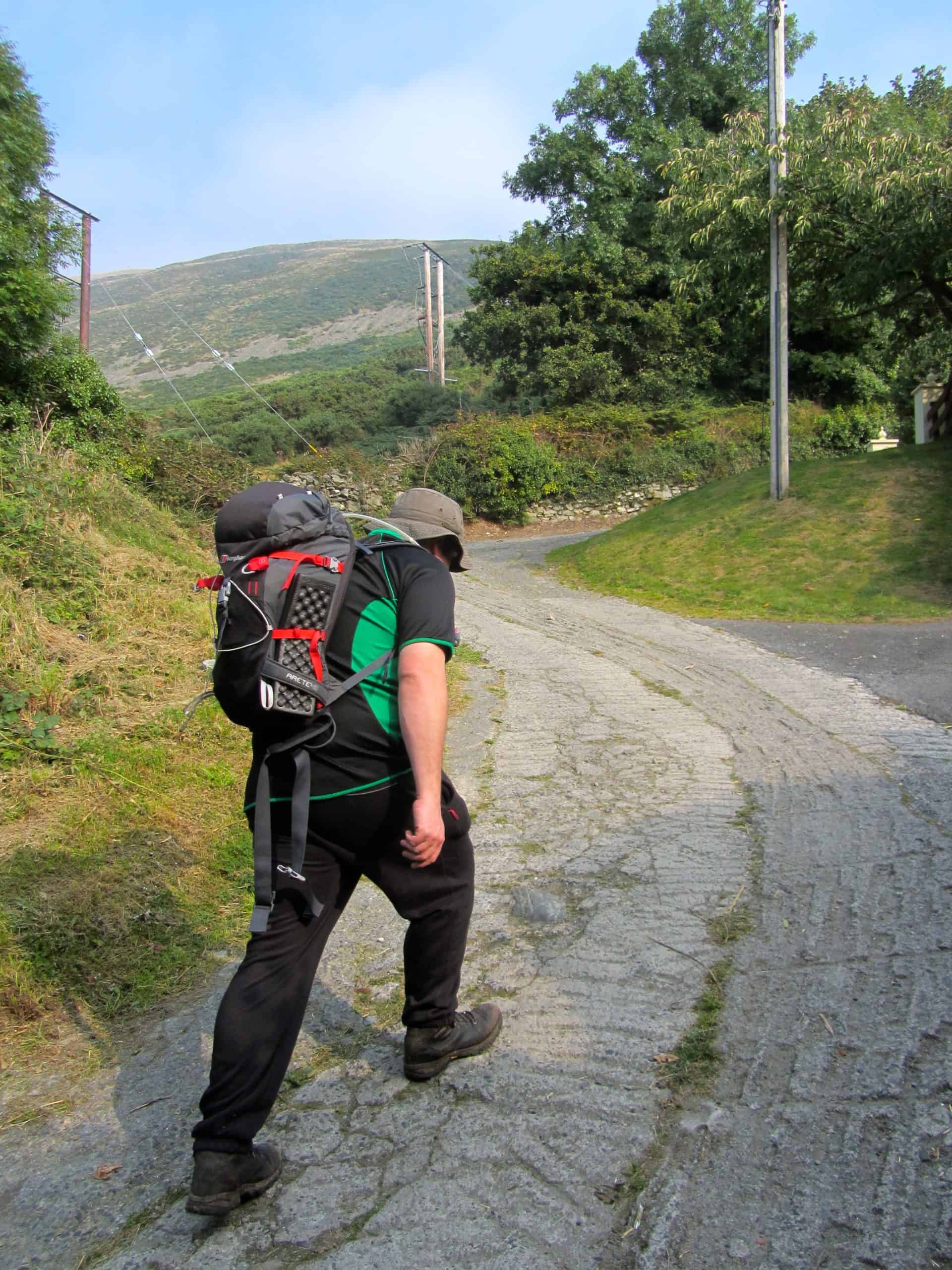 A hiker wearing a backpack exploring a scenic mountain trail, perfect for outdoor adventure enthusiasts.