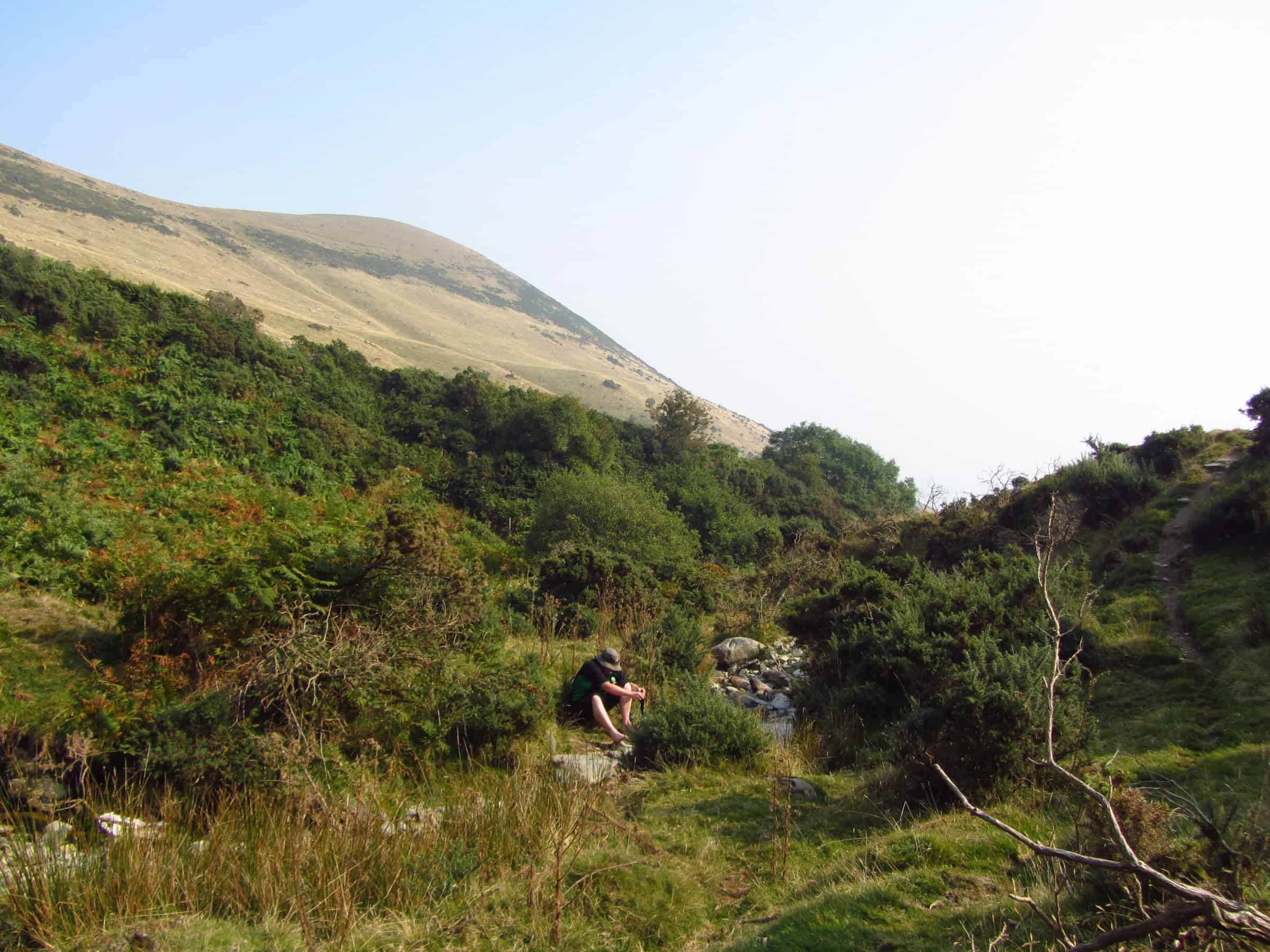 A hiker sitting on a rock by a stream in a scenic mountain landscape, emphasizing the beauty of hiking trails through lush greenery and rugged terrain, perfect for outdoor enthusiasts seeking scenic hikes.