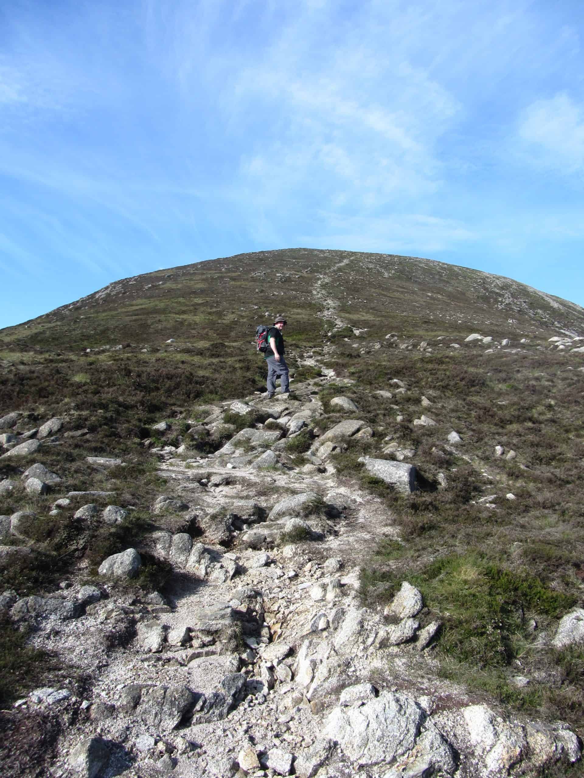 A hiker climbs a rocky trail on a grassy mountain slope with a clear blue sky overhead, enjoying outdoor adventure and nature exploration on a scenic hiking route.