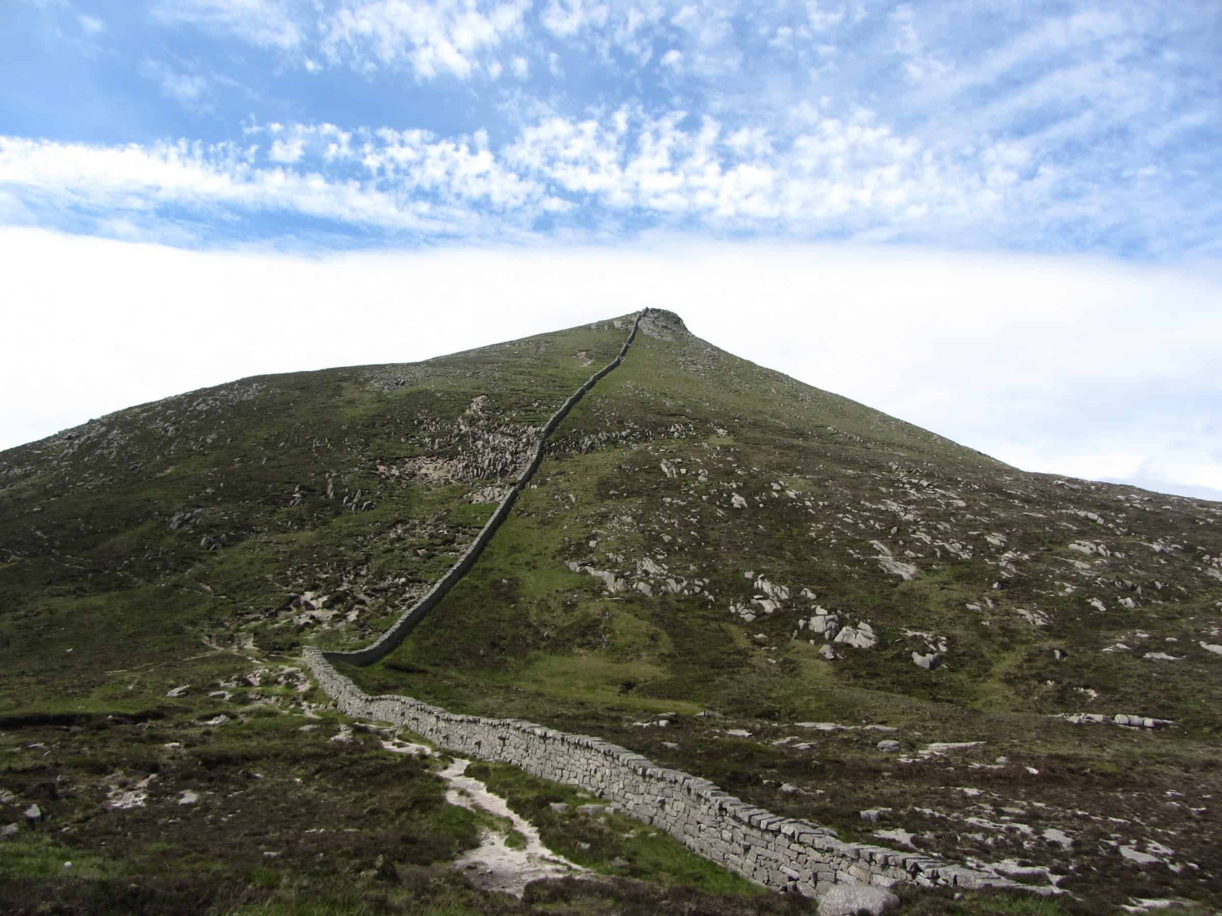 A scenic hiking trail on a mountain with a stone wall boundary, lush green grass, and a dramatic sky, perfect for outdoor adventure enthusiasts.