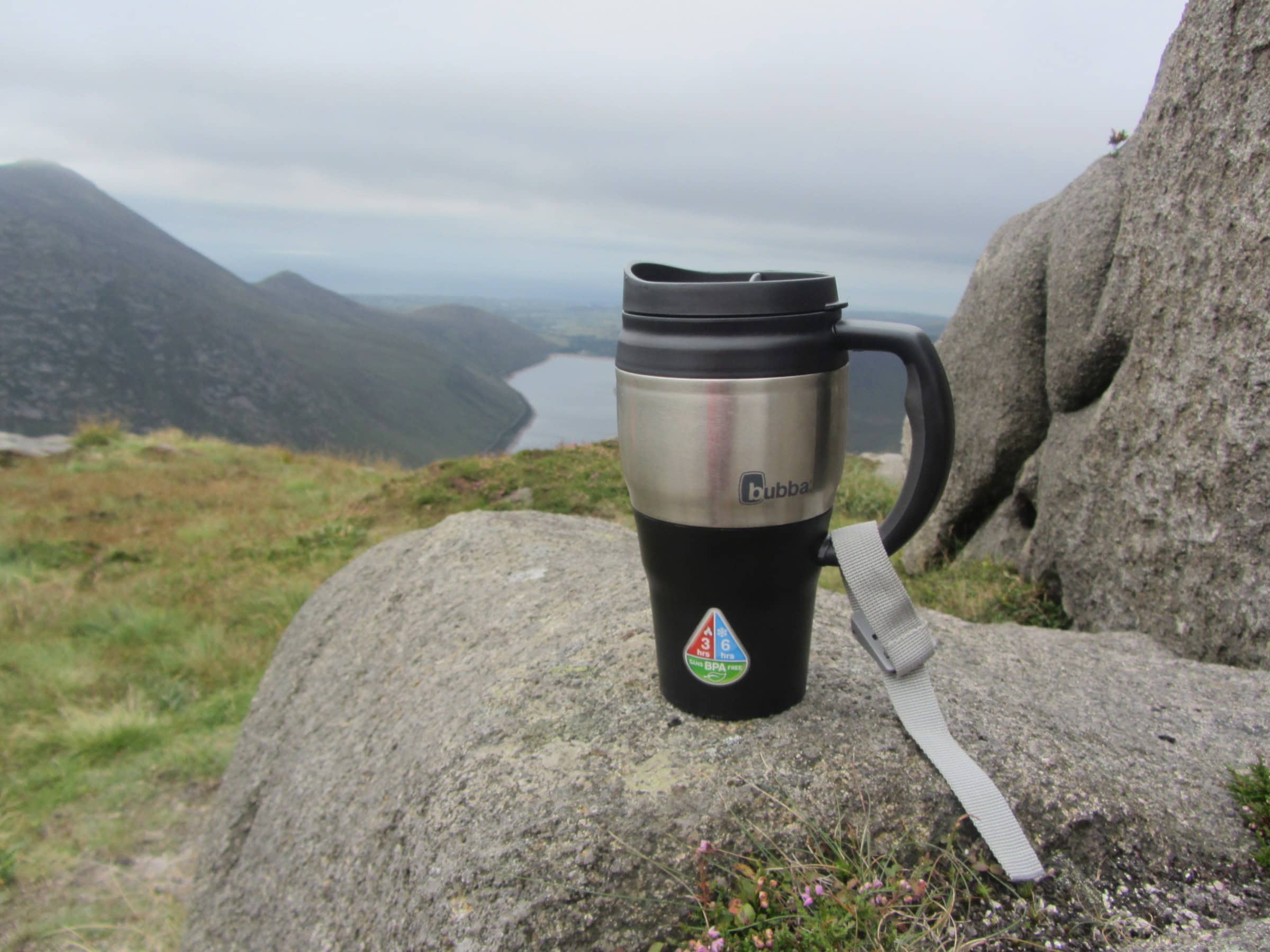 A durable, insulated stainless steel travel mug placed on a rocky outcrop during a mountain hike, capturing the essence of outdoor exploration, nature photography, and hiking gear essentials.