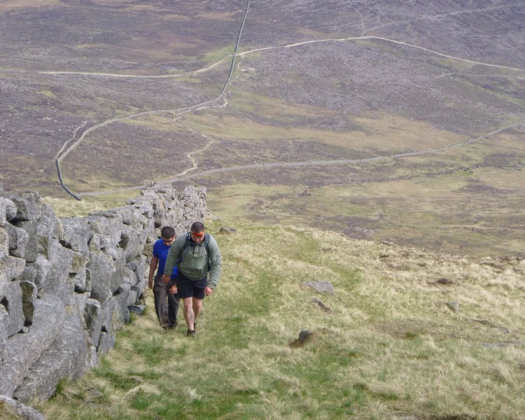 Two hikers trekking on a rugged outdoor trail in a scenic, natural landscape with stone walls and expansive views.
