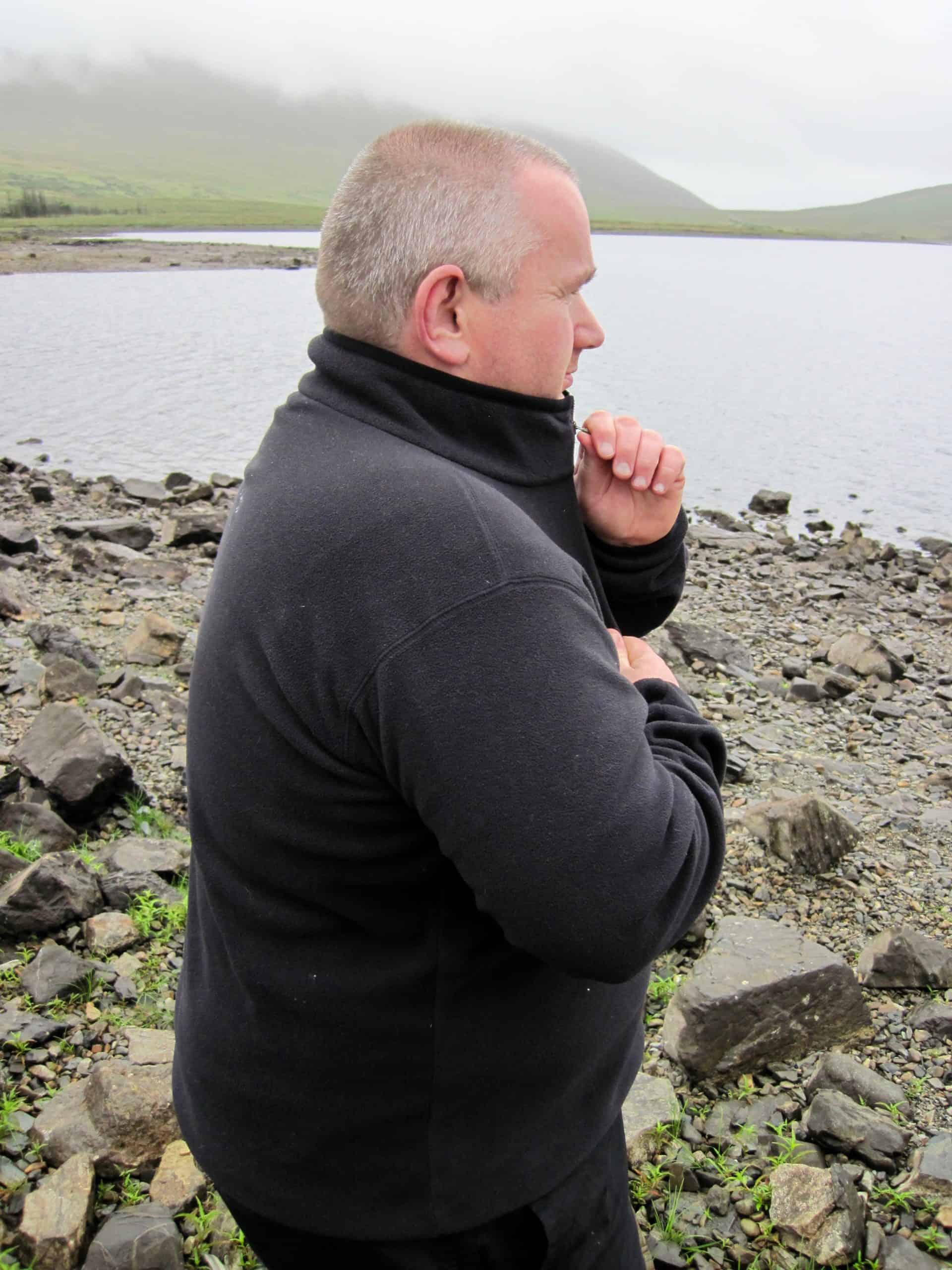A hiker dressed in outdoor gear enjoys a peaceful moment beside a serene river surrounded by rocky terrain and lush green hills, ideal for nature walks and exploring the great outdoors.