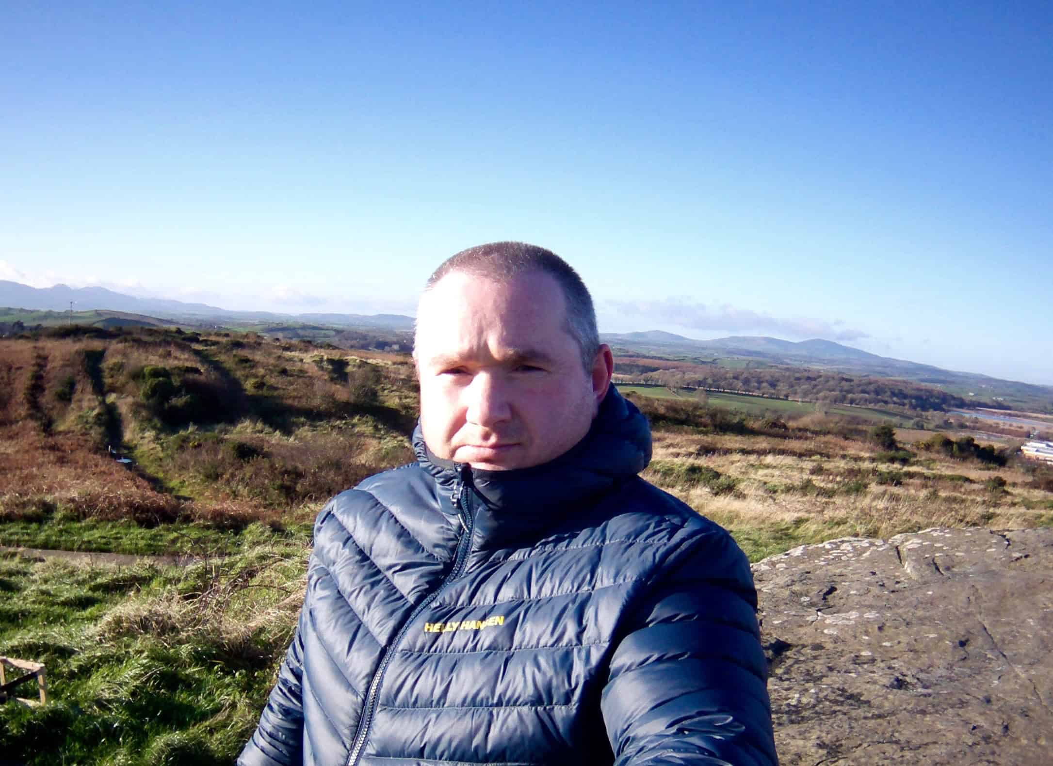 A hiker in a blue Helly Hansen jacket exploring the natural beauty of countryside with expansive views, lush greenery, and distant mountains.