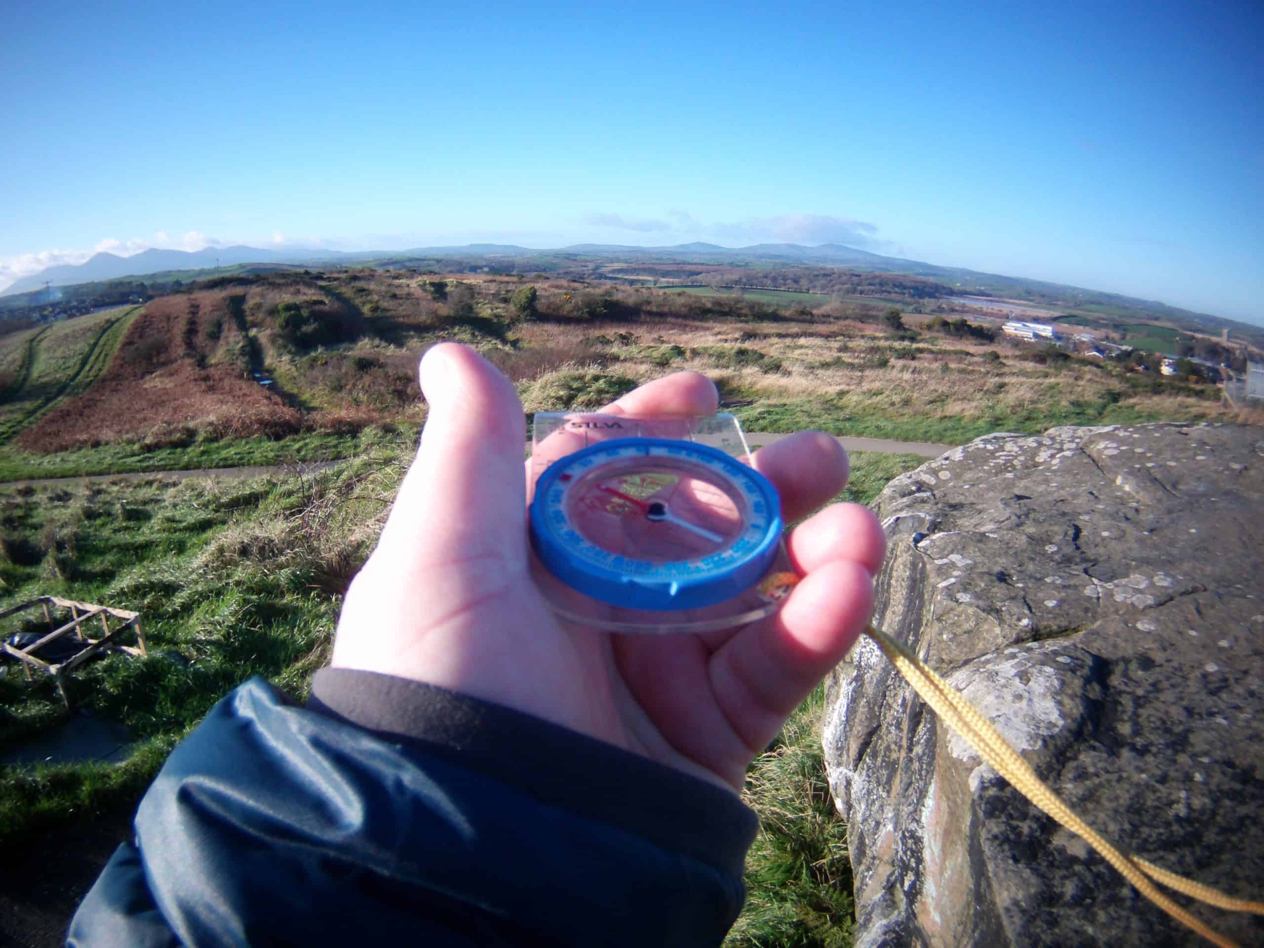 A hiker uses a compass to navigate the scenic landscape of rolling hills, clear skies, and distant mountain ranges, showcasing outdoor exploration and navigation skills in nature.