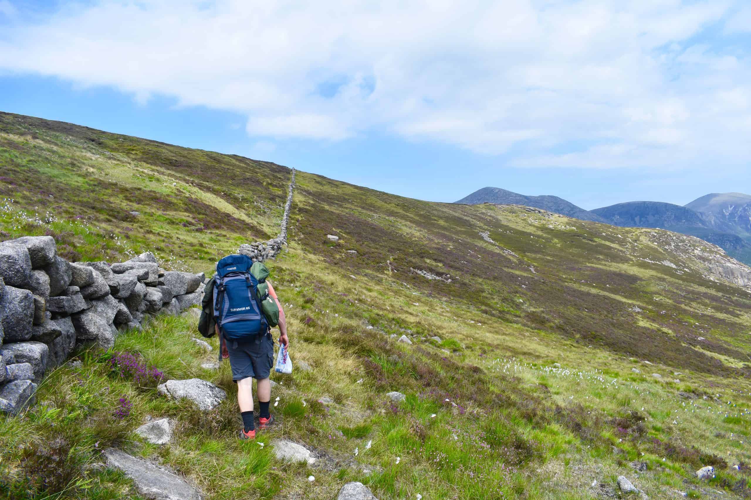 A hiker with a backpack walks along a mountain trail through lush green meadows, surrounded by beautiful rolling hills and distant peaks, perfect for outdoor enthusiasts and nature lovers.