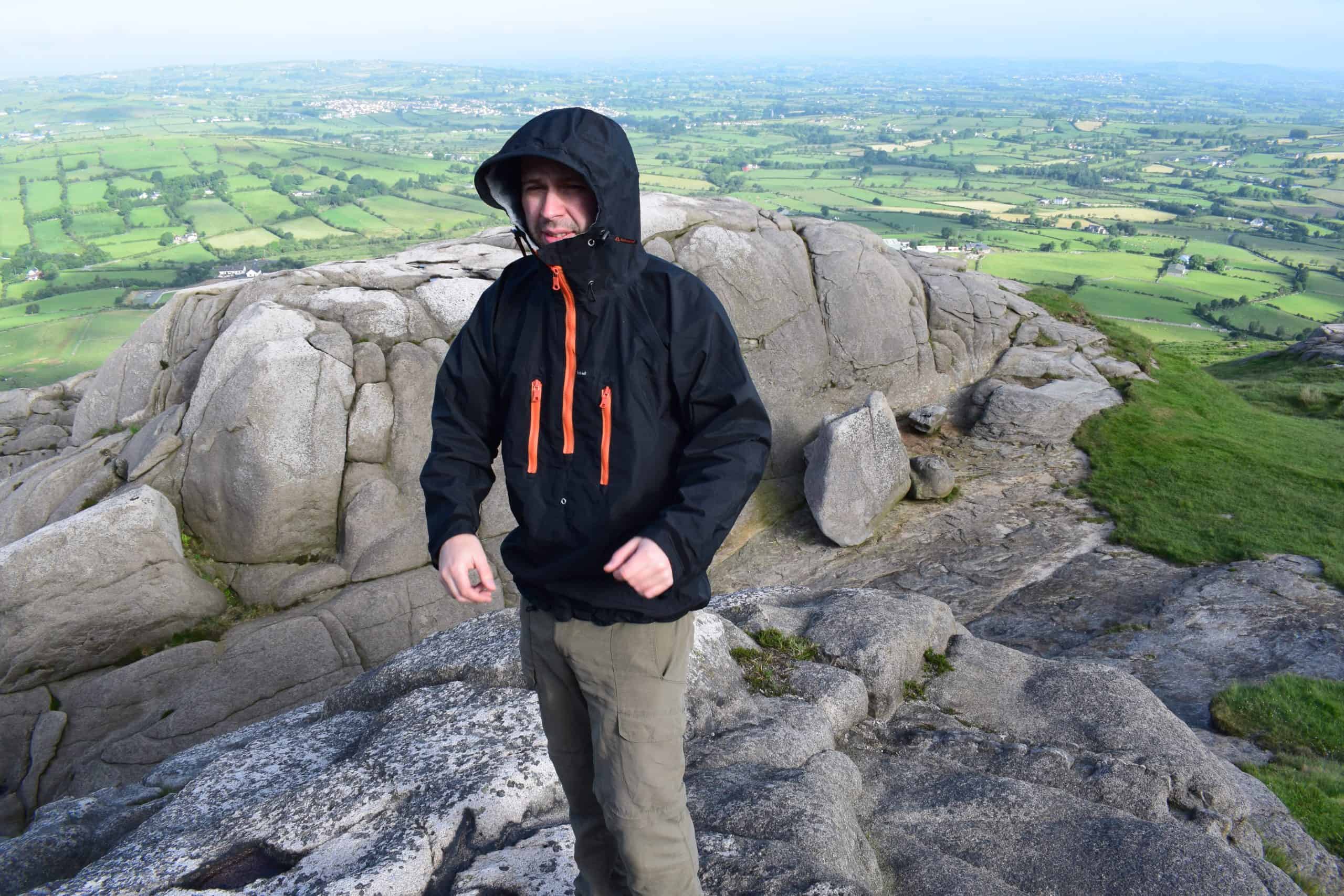 A hiker wearing a black waterproof jacket with orange accents exploring a rocky outcrop during a scenic outdoor adventure, with expansive green countryside and rolling hills visible in the distance.