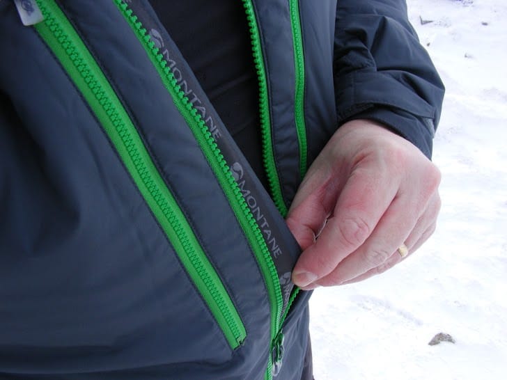 Close-up of a hiker’s waterproof outdoor jacket with green zippers, suitable for cold weather mountain trekking and hiking adventures.