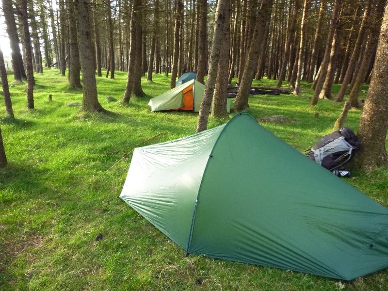 A small green tent set up amidst tall trees in a peaceful forest, perfect for hikers and outdoor enthusiasts.