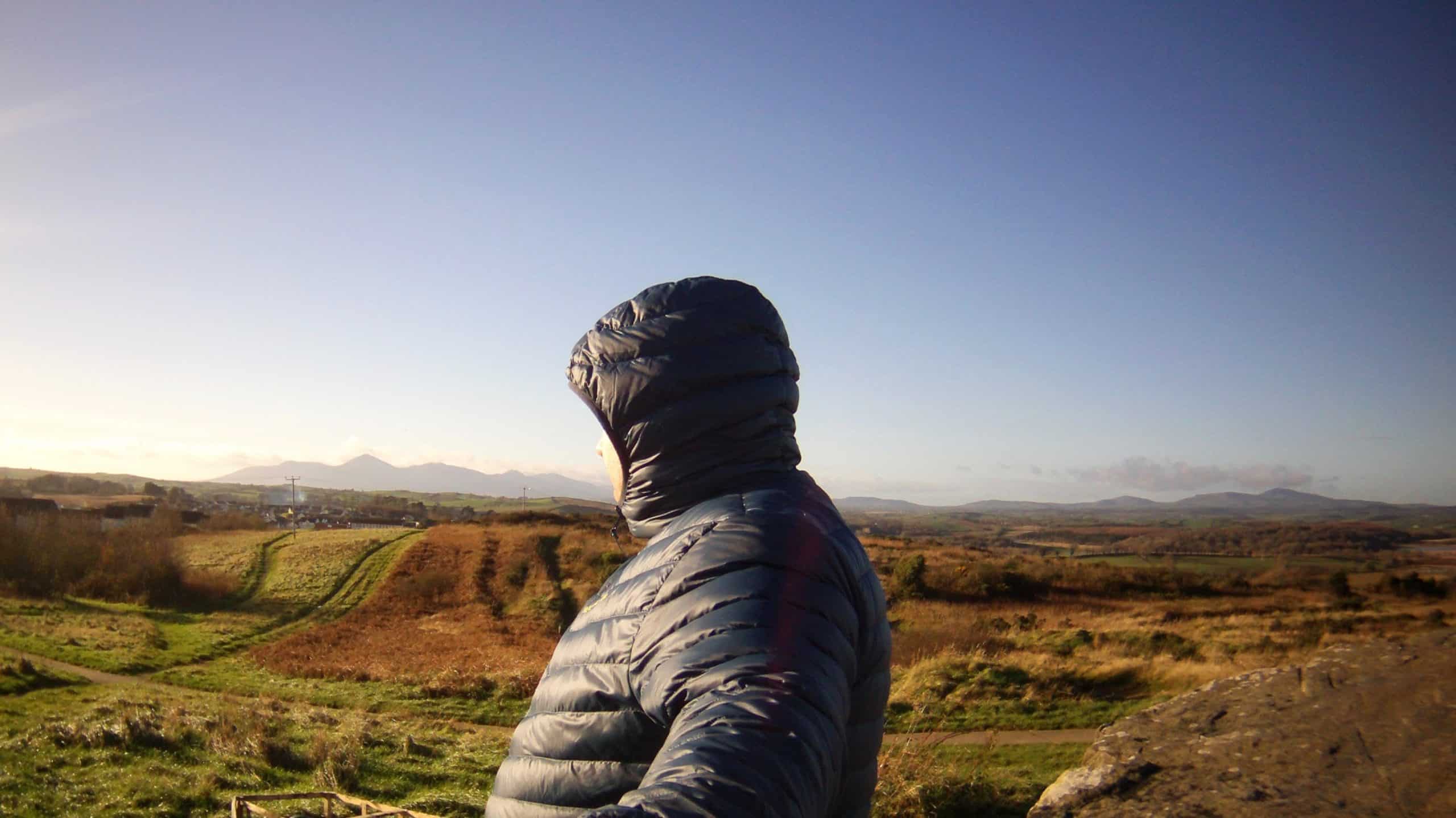 A hiker wearing a puffy jacket gazes over scenic rolling hills and open landscapes, capturing the essence of outdoor adventure and hiking in nature.