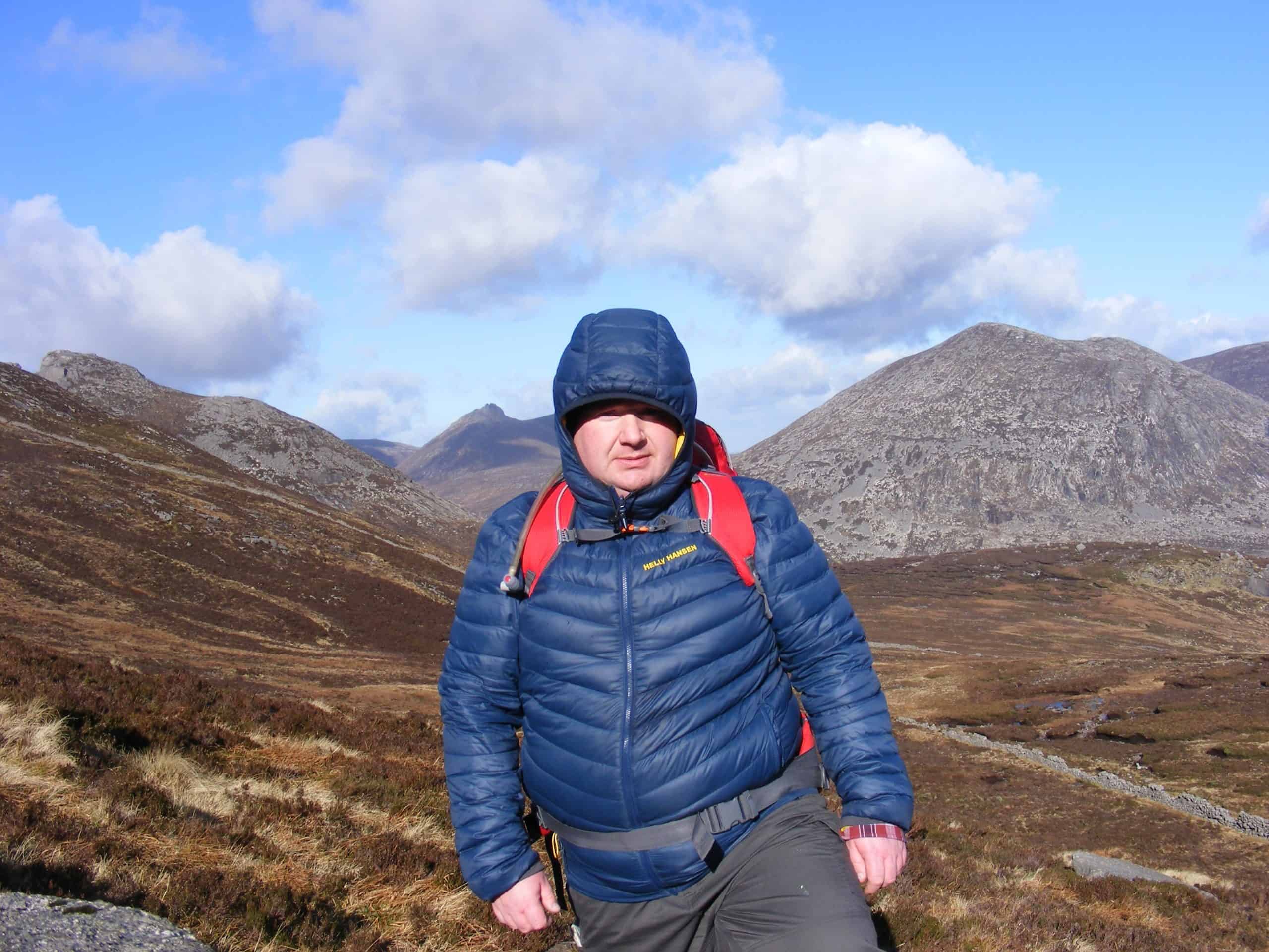 A hiker in outdoor gear trekking through a scenic mountainous terrain during a cloudy day, showcasing adventure and hiking in remote nature.