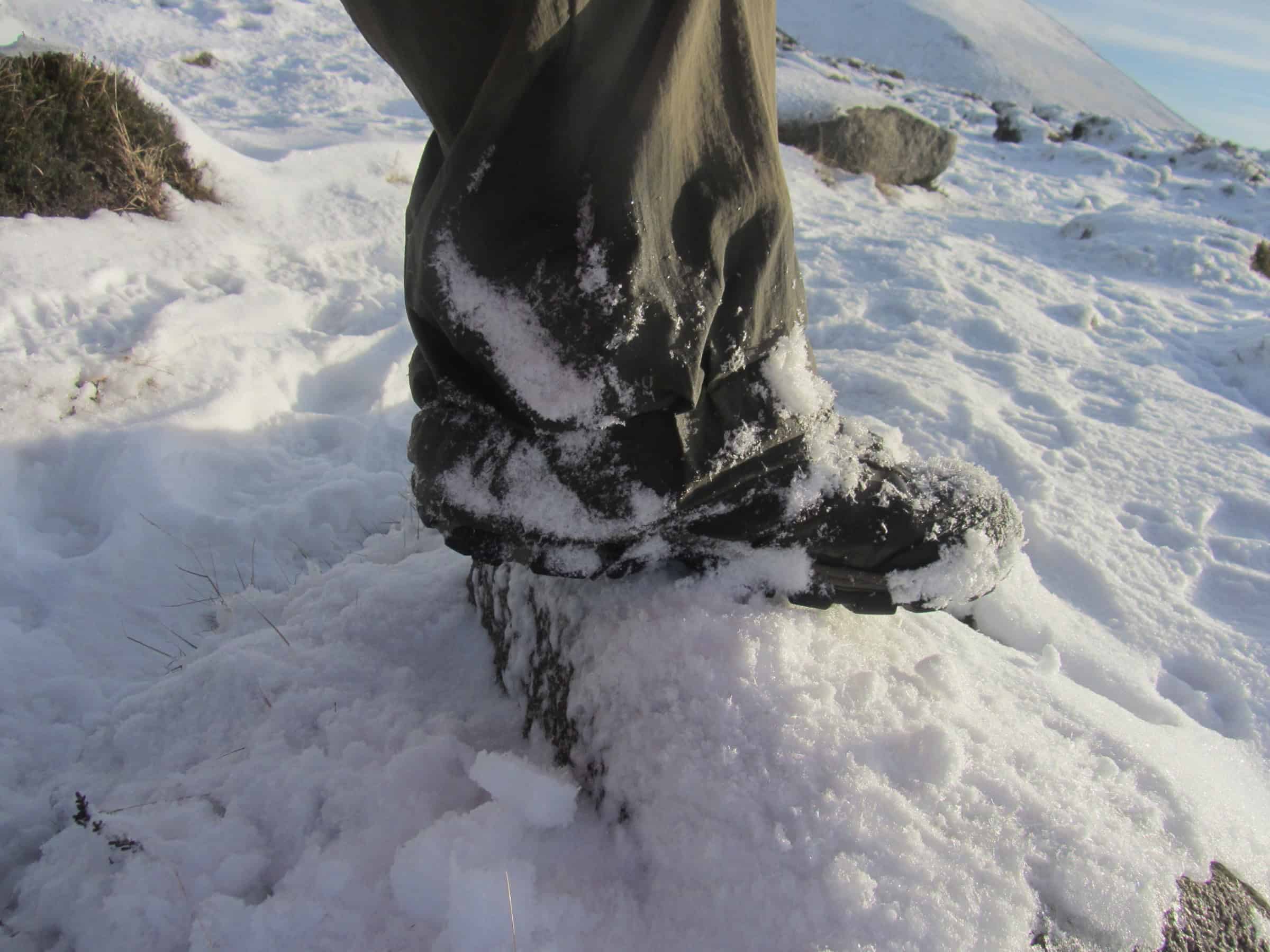Close-up of rugged hiking boots and snow-dusted pants on a snowy trail, showcasing winter hiking gear ideal for snow and cold conditions.