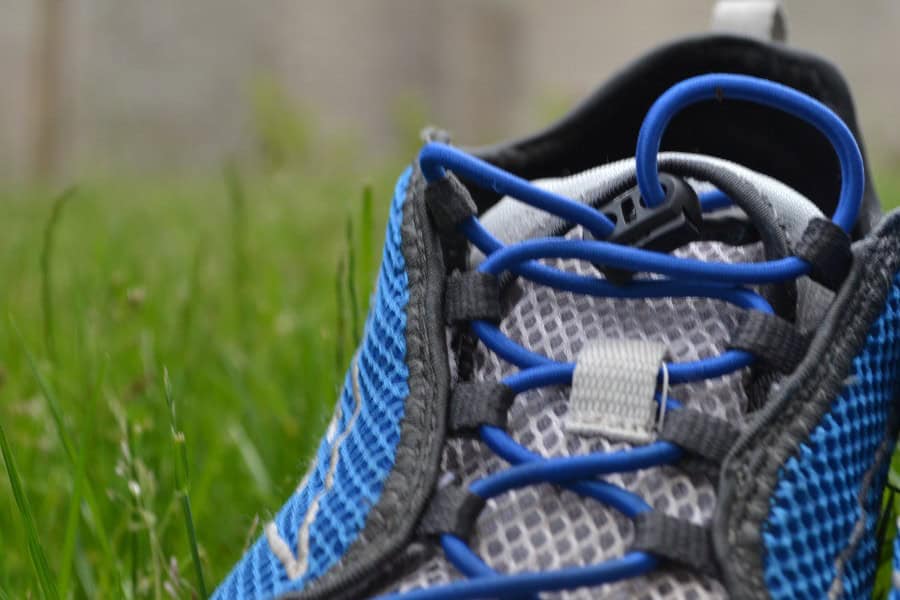 A close-up of a durable, breathable hiking shoe featuring vibrant blue laces and supportive design, perfect for outdoor trekking, trail walking, and hiking adventures, showcasing the gear needed for comfortable and safe outdoor exploration.