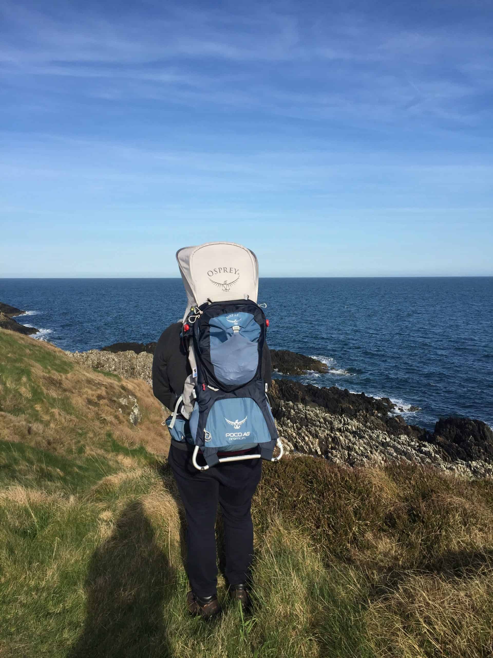 A hiker stands on grassy coastal cliff with ocean view, wearing a large blue Osprey backpack, exploring scenic trails along the rugged shoreline.