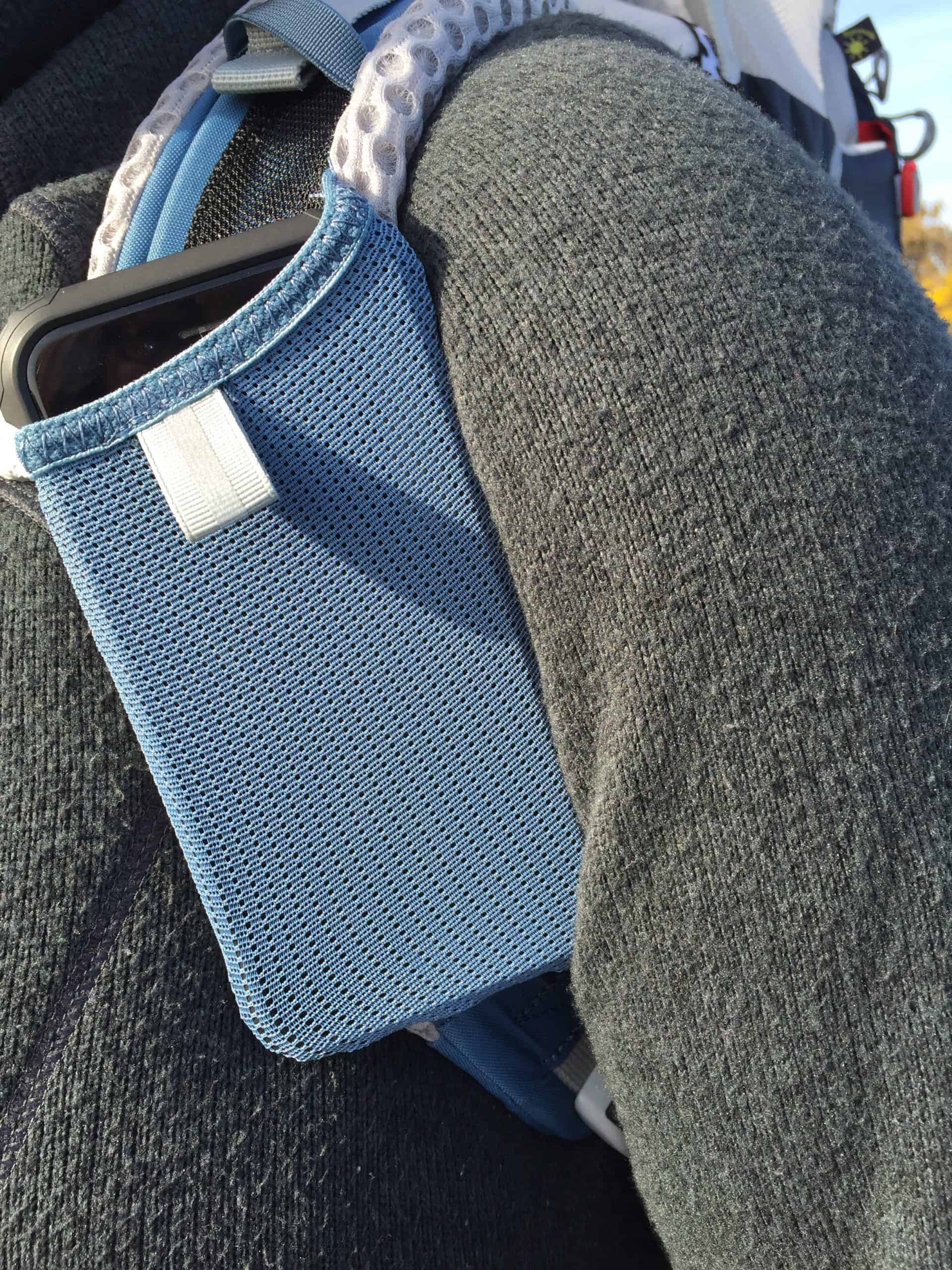 A close-up image of a hiker’s strap with a blue water bottle holder attached to a backpack, showcasing essential outdoor hydration gear. The photograph highlights the practical and portable design of hiking accessories, perfect for outdoor enthusiasts exploring trails and nature. Ideal for blog content focused on hiking gear reviews, outdoor tips, and trekking necessities.