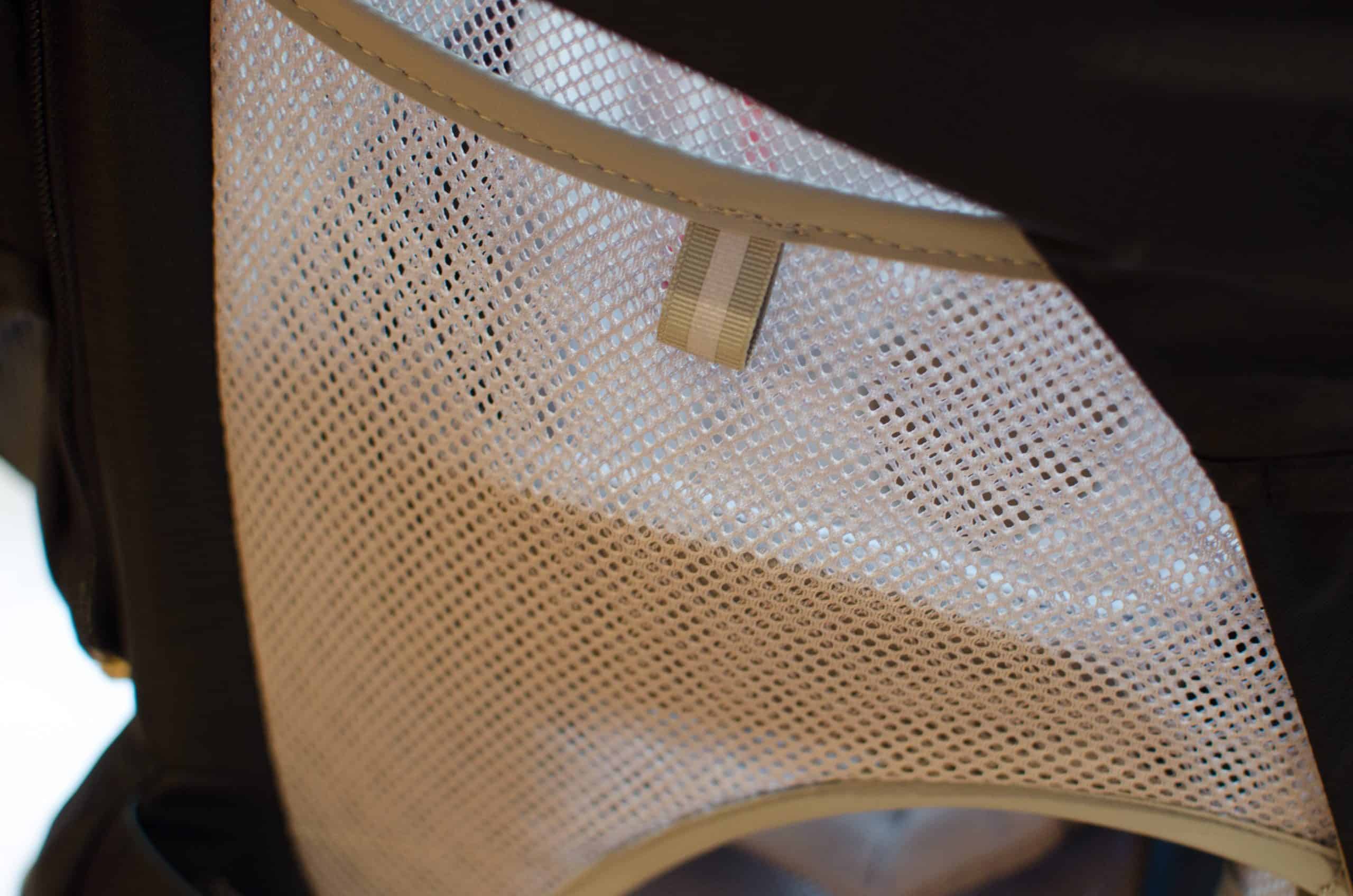 A close-up shot of the mesh pocket on a hiking backpack, highlighting its breathable design and secure strap. Perfect for outdoor enthusiasts who need practical storage solutions on trails, emphasizing durability and convenience for hiking gear organization.