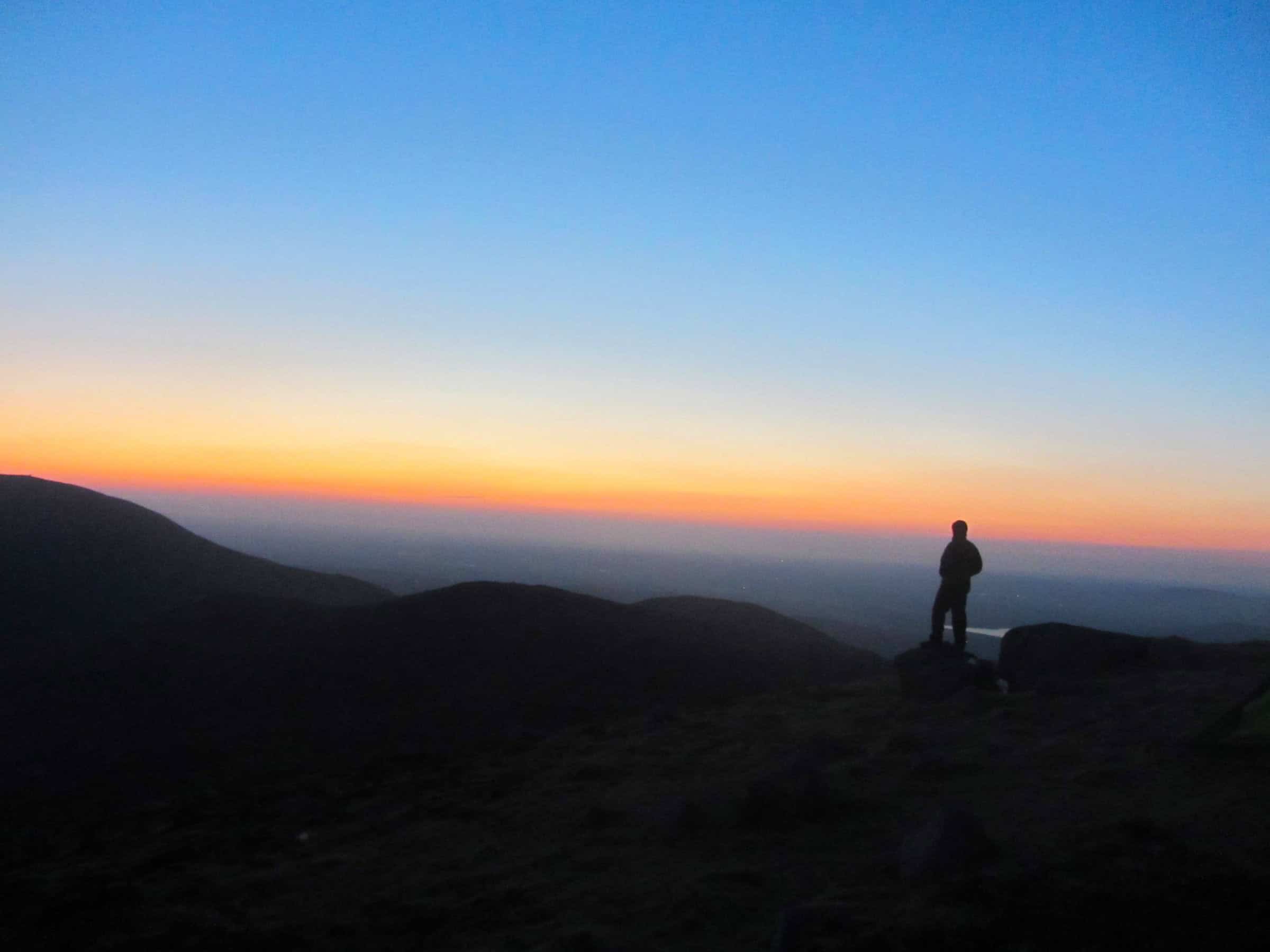 A breathtaking evening scene featuring a hiker overlooking a mountain range at sunset with a colorful sky, perfect for hiking and outdoor exploration topics.