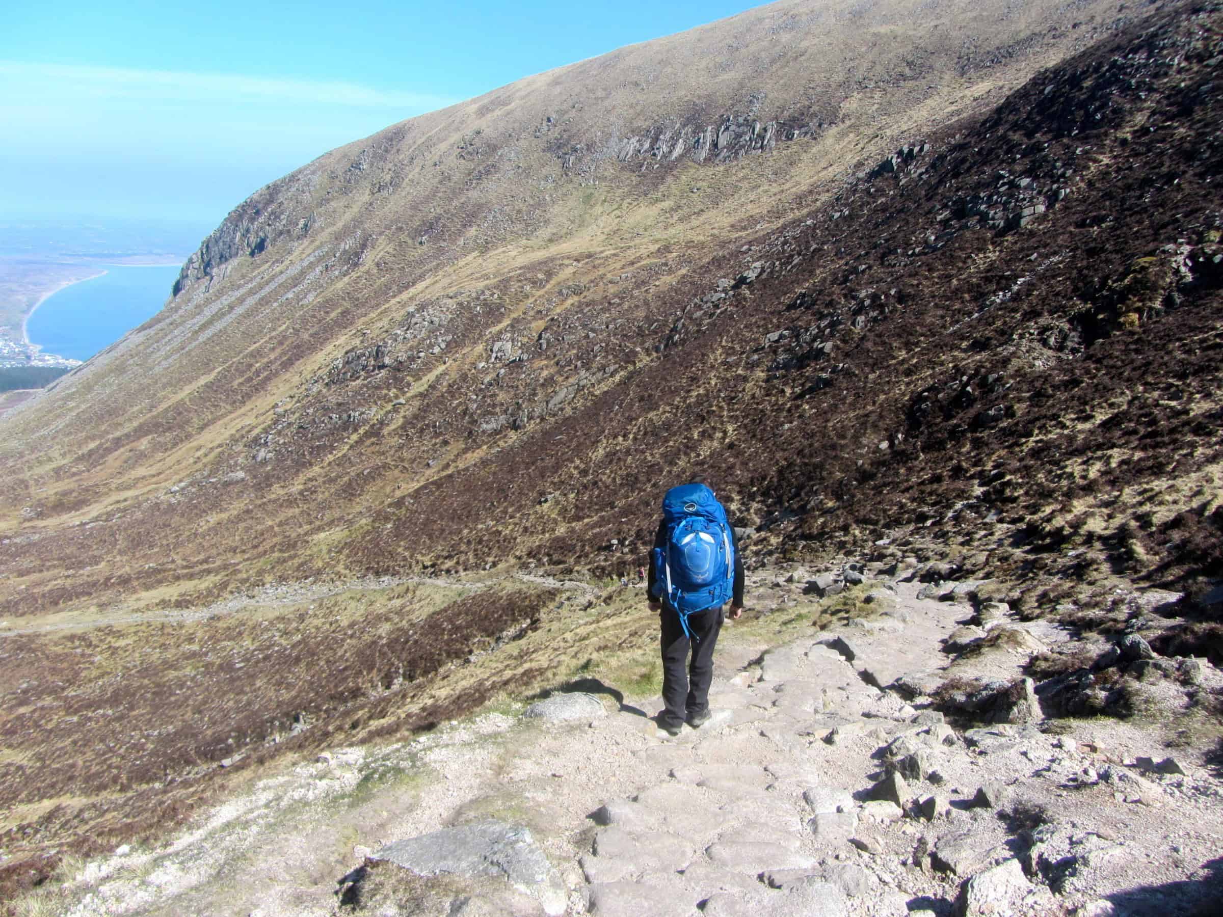 Embark on a scenic mountain hike with this breathtaking view of steep slopes, rocky pathways, and distant lakes, ideal for outdoor explorers and trekking enthusiasts seeking adventure in nature.