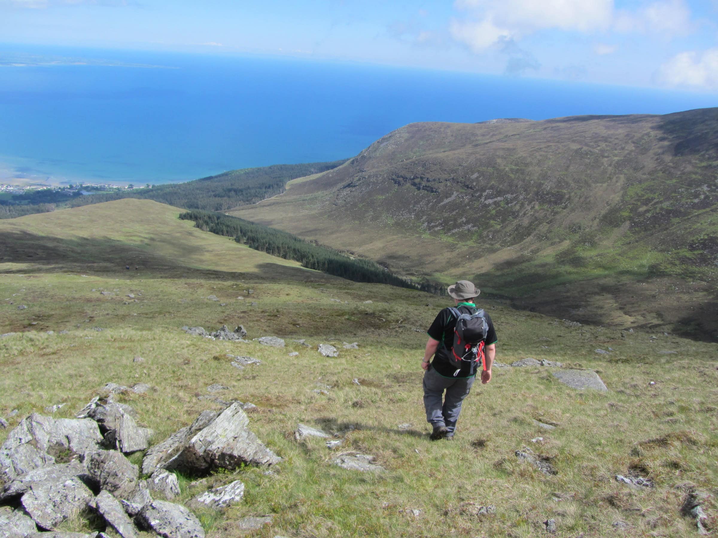 Scenic mountain hiking trail with a hiker enjoying the outdoor scenery and ocean views, showcasing adventure travel and outdoor activities ideal for hiking enthusiasts.