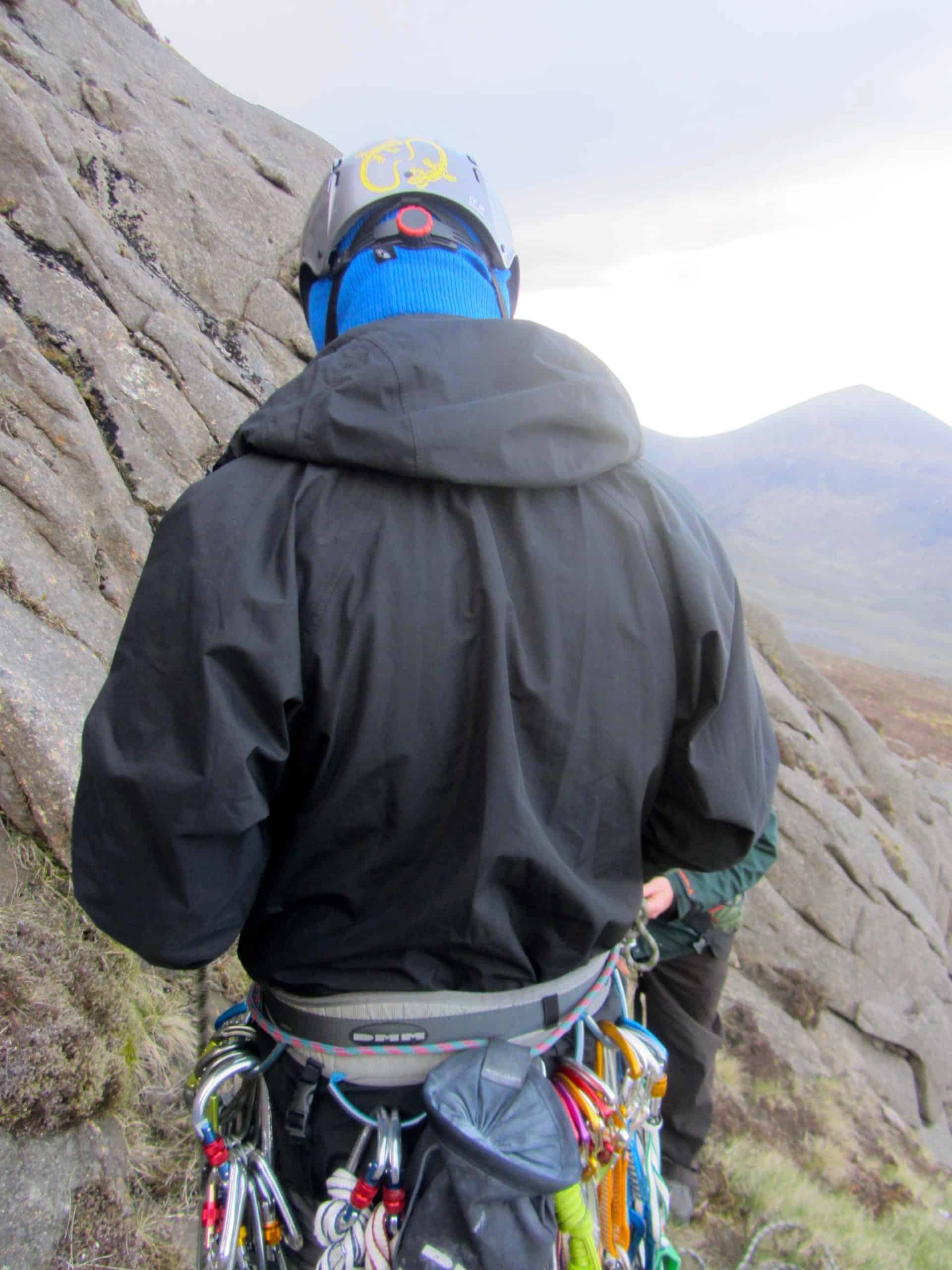 A climber in a black jacket and helmet stands on a mountain slope with climbing gear and carabiners, ready for a rock climbing adventure in the mountains.