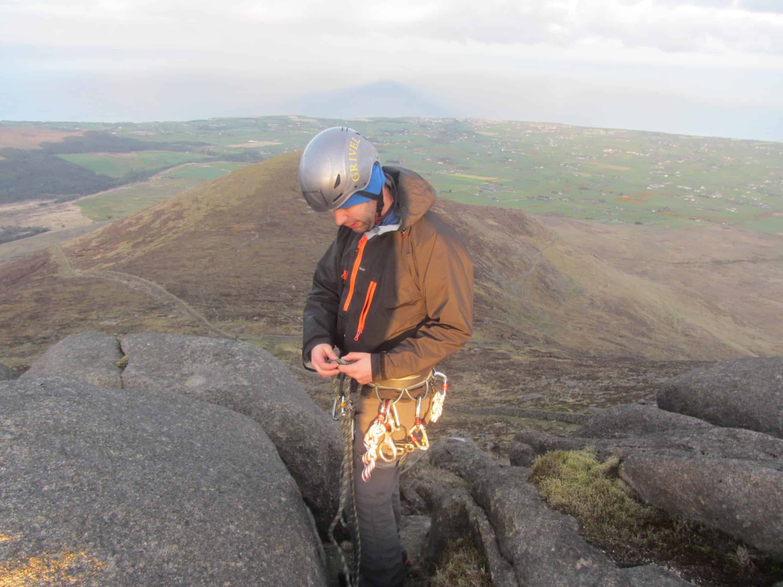 A hiker or climber in safety gear preparing for a mountain climb on a rugged rocky terrain.