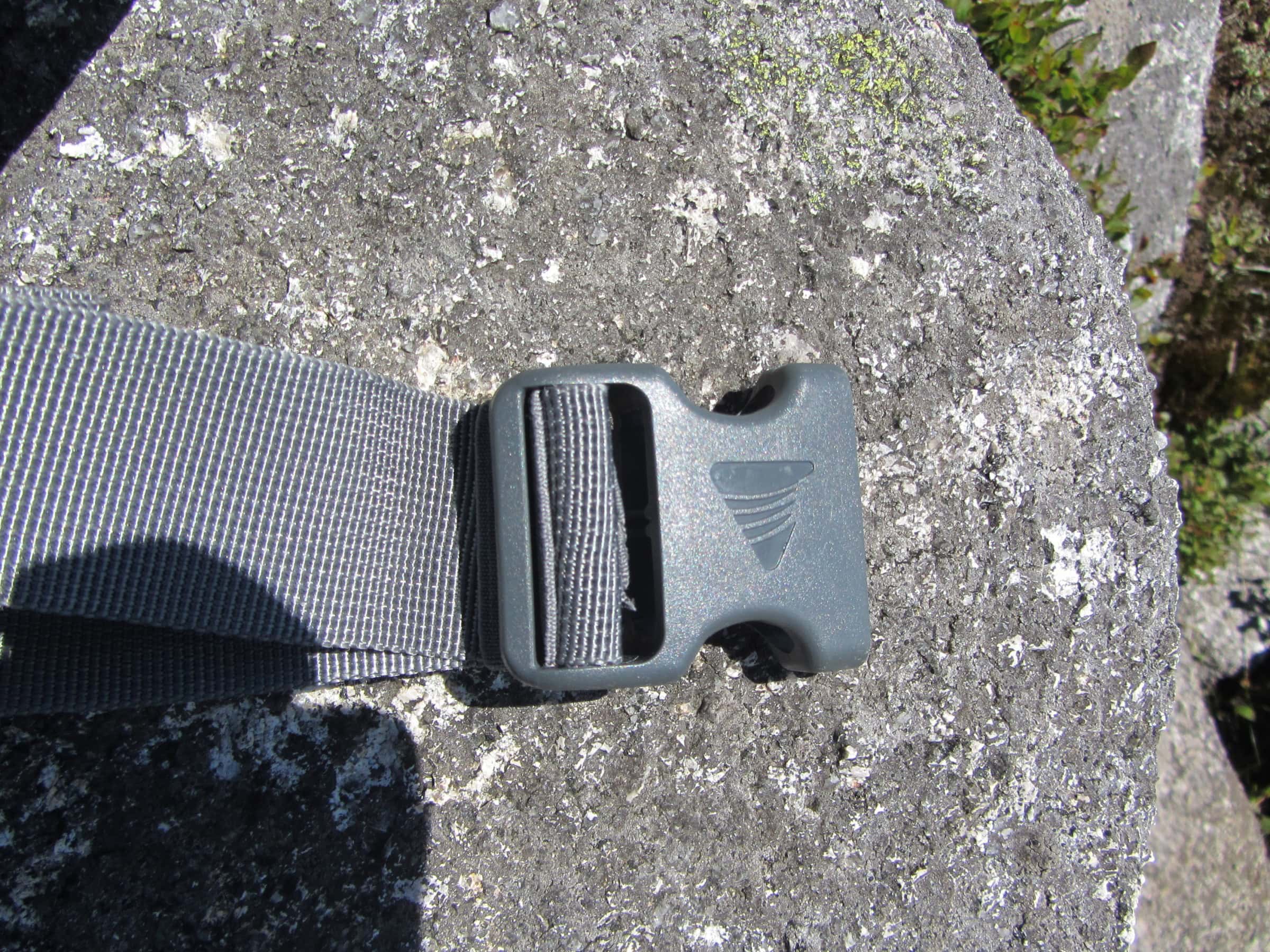 Durable gray strap buckle used for securing hiking backpacks or outdoor gear, shown attached to a thick strap resting on a rough stone surface, perfect for hiking and adventure equipment.