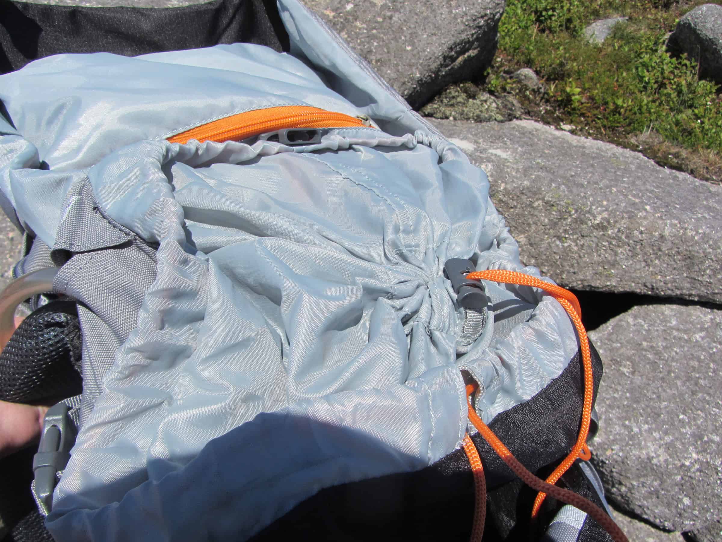A close-up of a gray outdoor hiking backpack with orange zippers and cords resting on rocky terrain, designed for durability and comfort, perfect for hiking, trekking, and outdoor adventures on rugged trails.