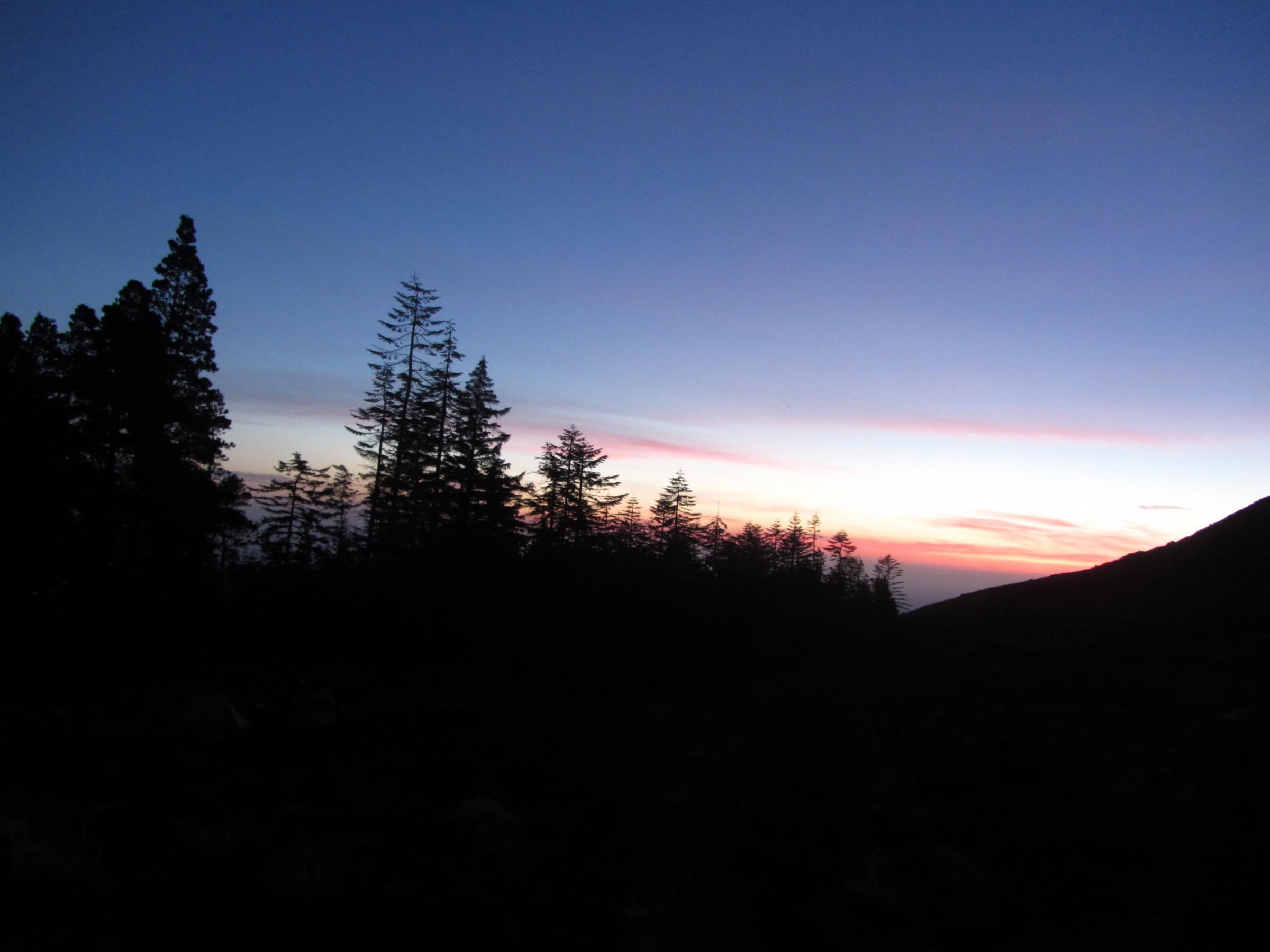 A stunning sunset over a peaceful mountain landscape featuring tall pine trees and a clear sky transitioning from warm hues to deep blue, ideal for outdoor hiking inspiration.