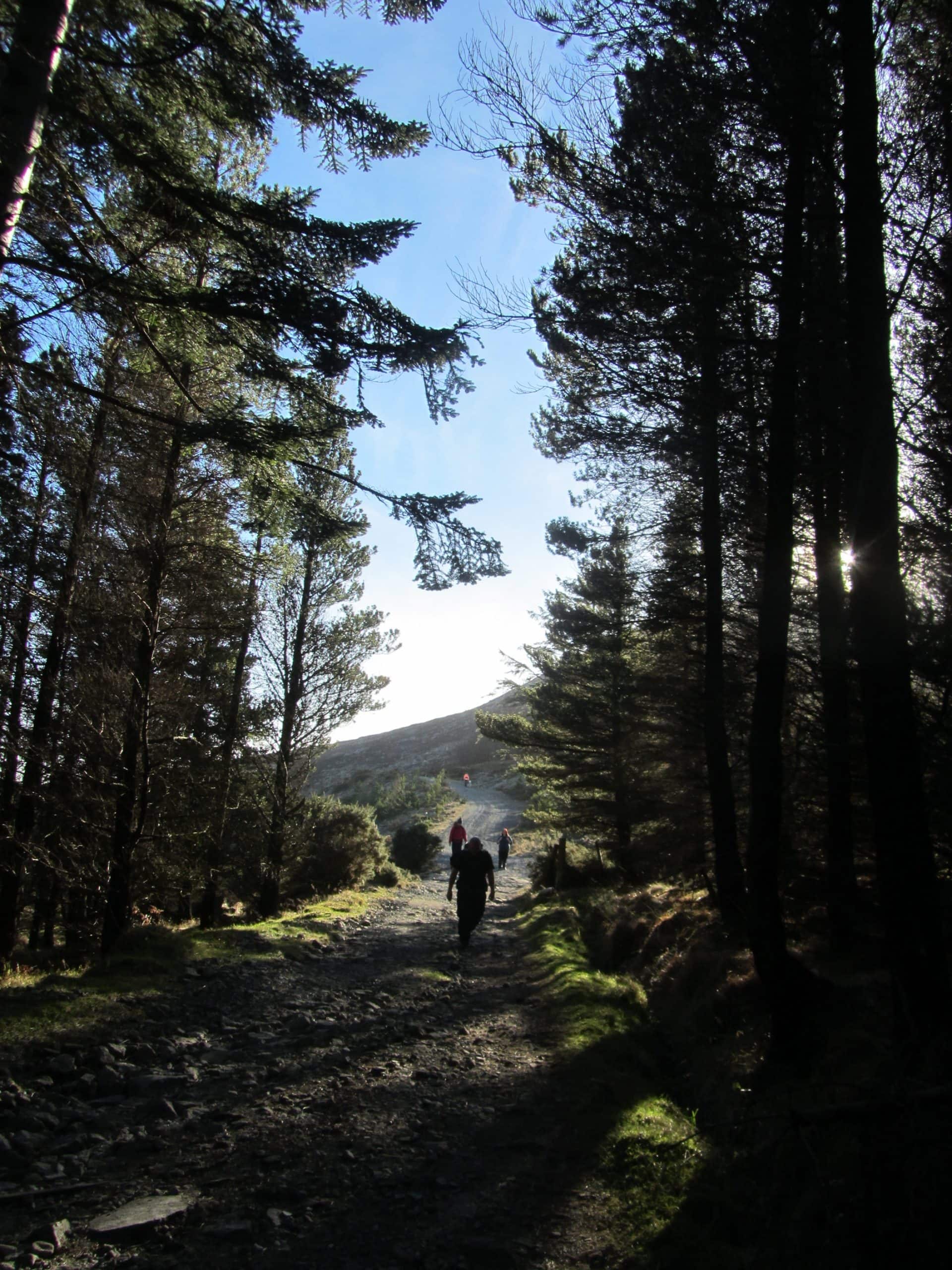 A lush hiking trail through dense woodland, with multiple hikers enjoying a mountain trek amidst towering evergreen trees and scenic natural surroundings.
