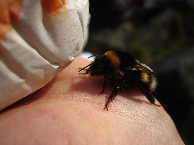 A bee landing on a person’s skin, illustrating the importance of pollinators in nature and outdoor exploration.
