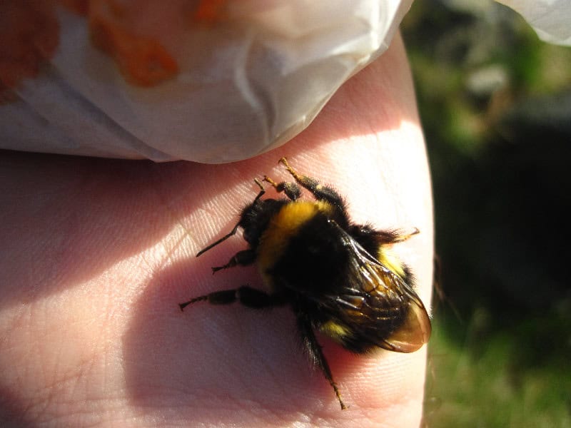 A bee collecting nectar and pollen on a human hand outdoors, demonstrating pollination and the importance of bees for environmental health.