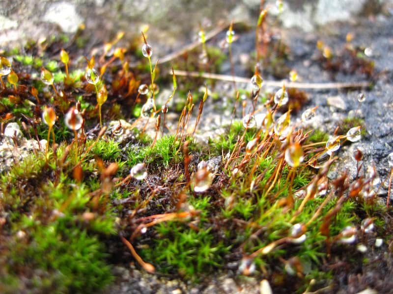 Close-up of moss and tiny plants with dew drops, showcasing lush greenery on a forest trail, perfect for outdoor and hiking content.